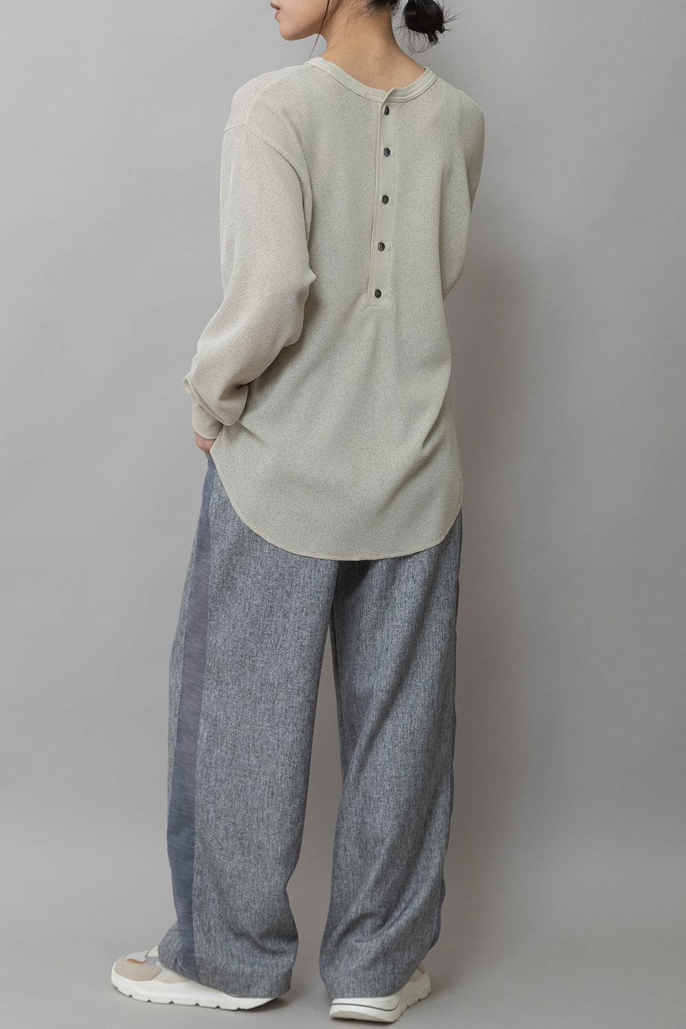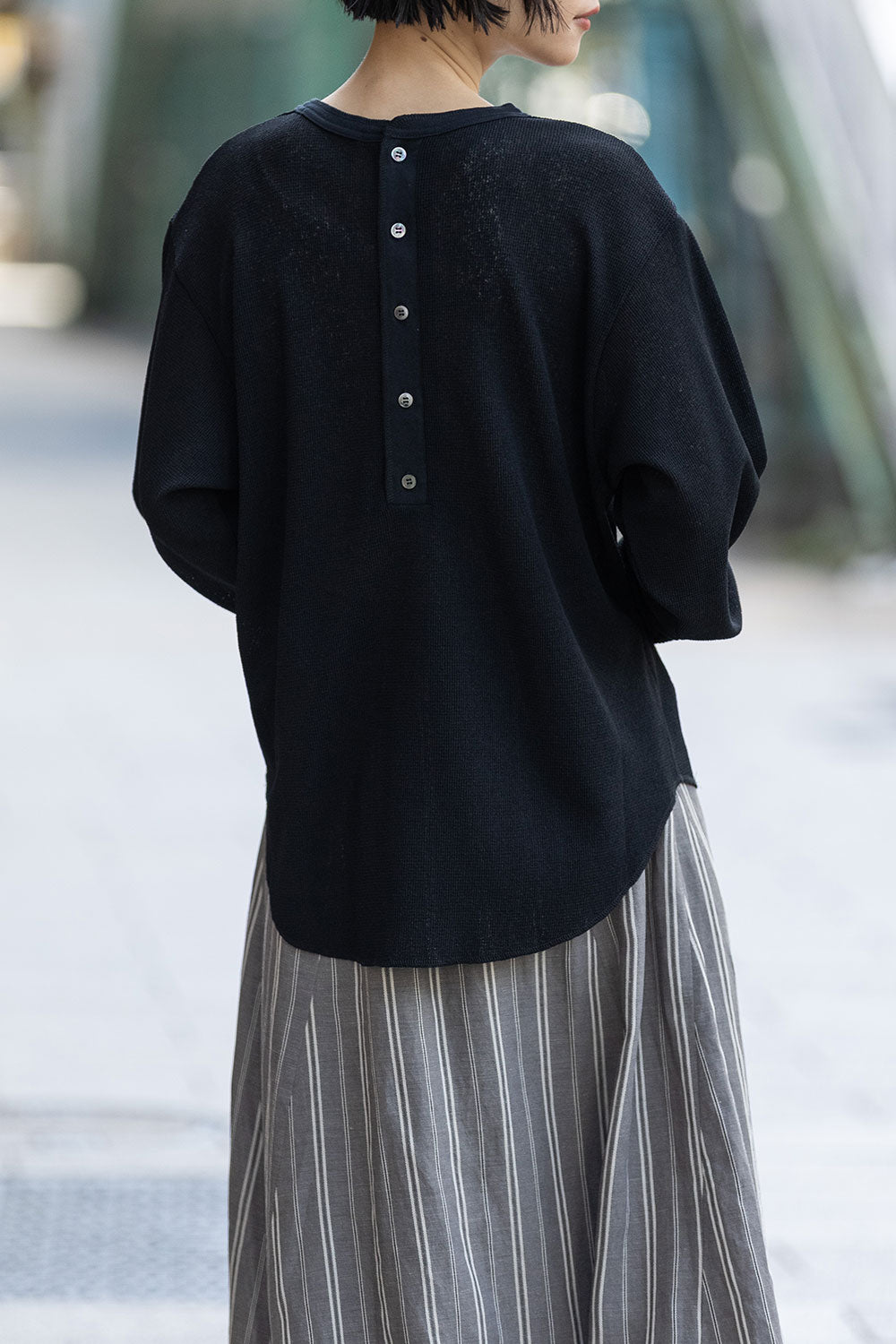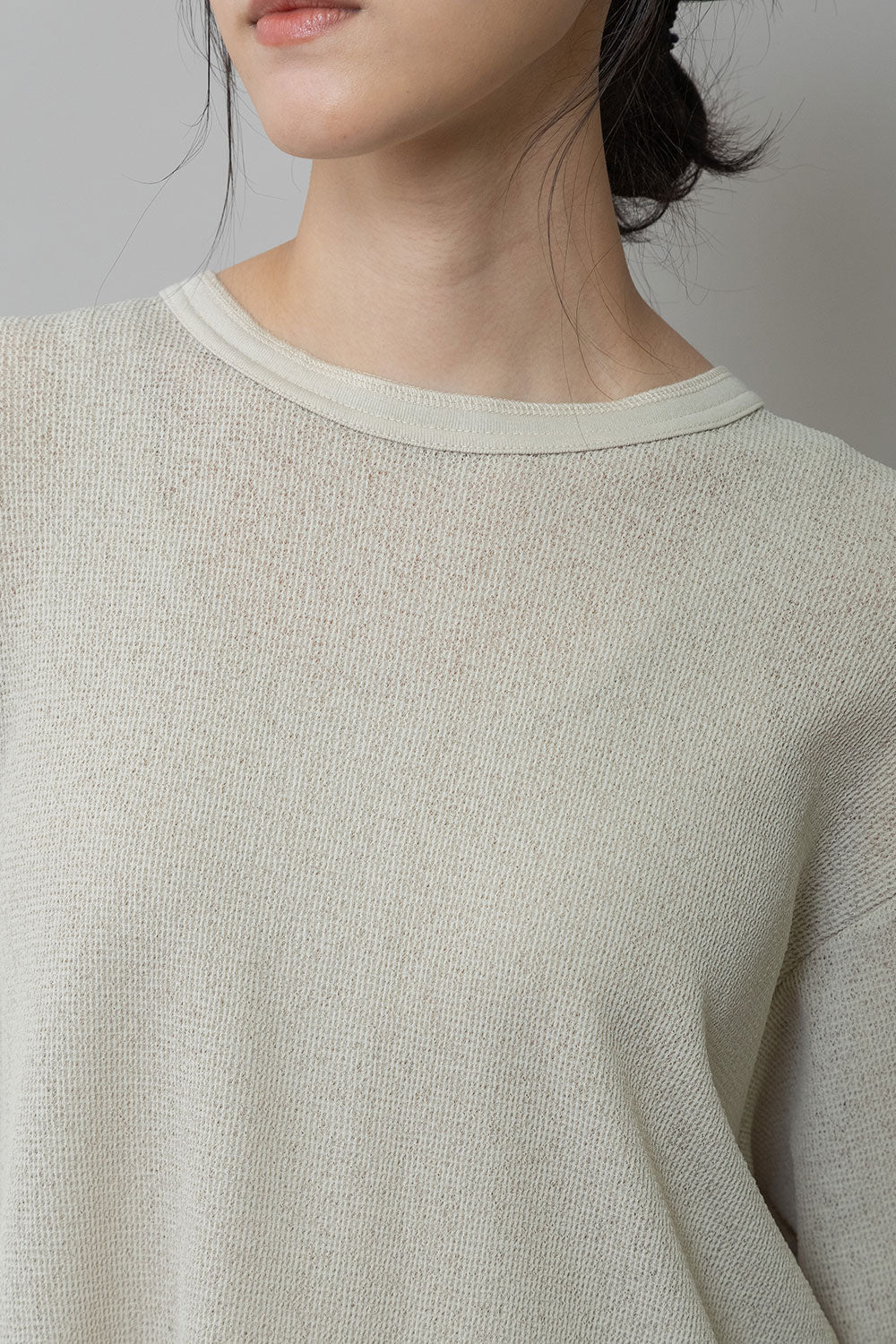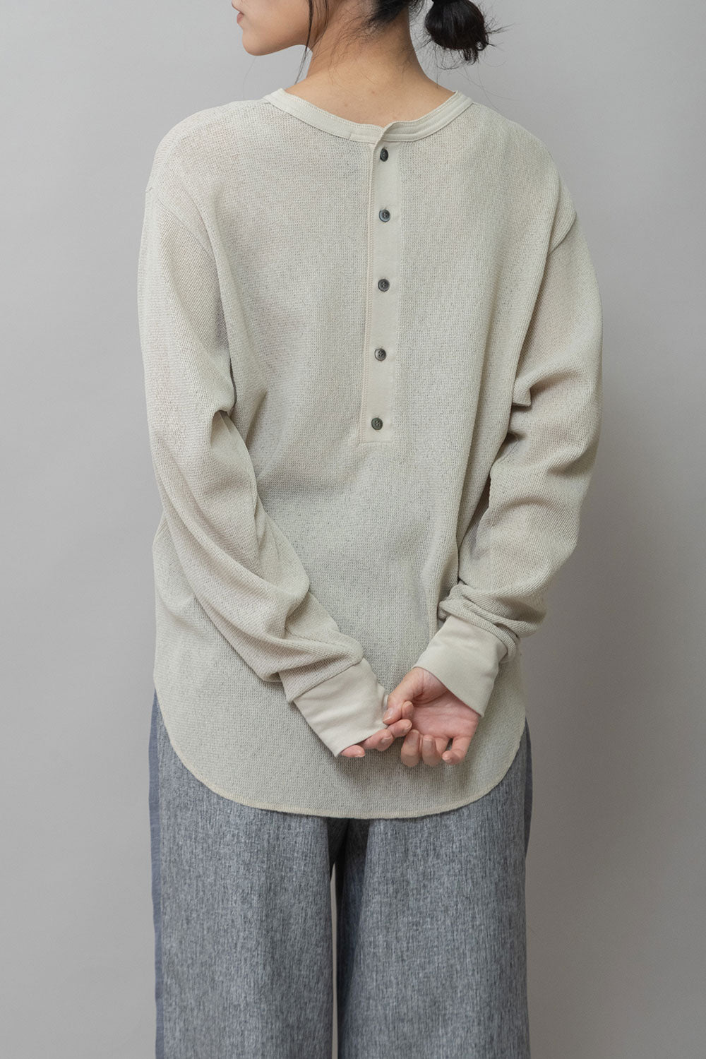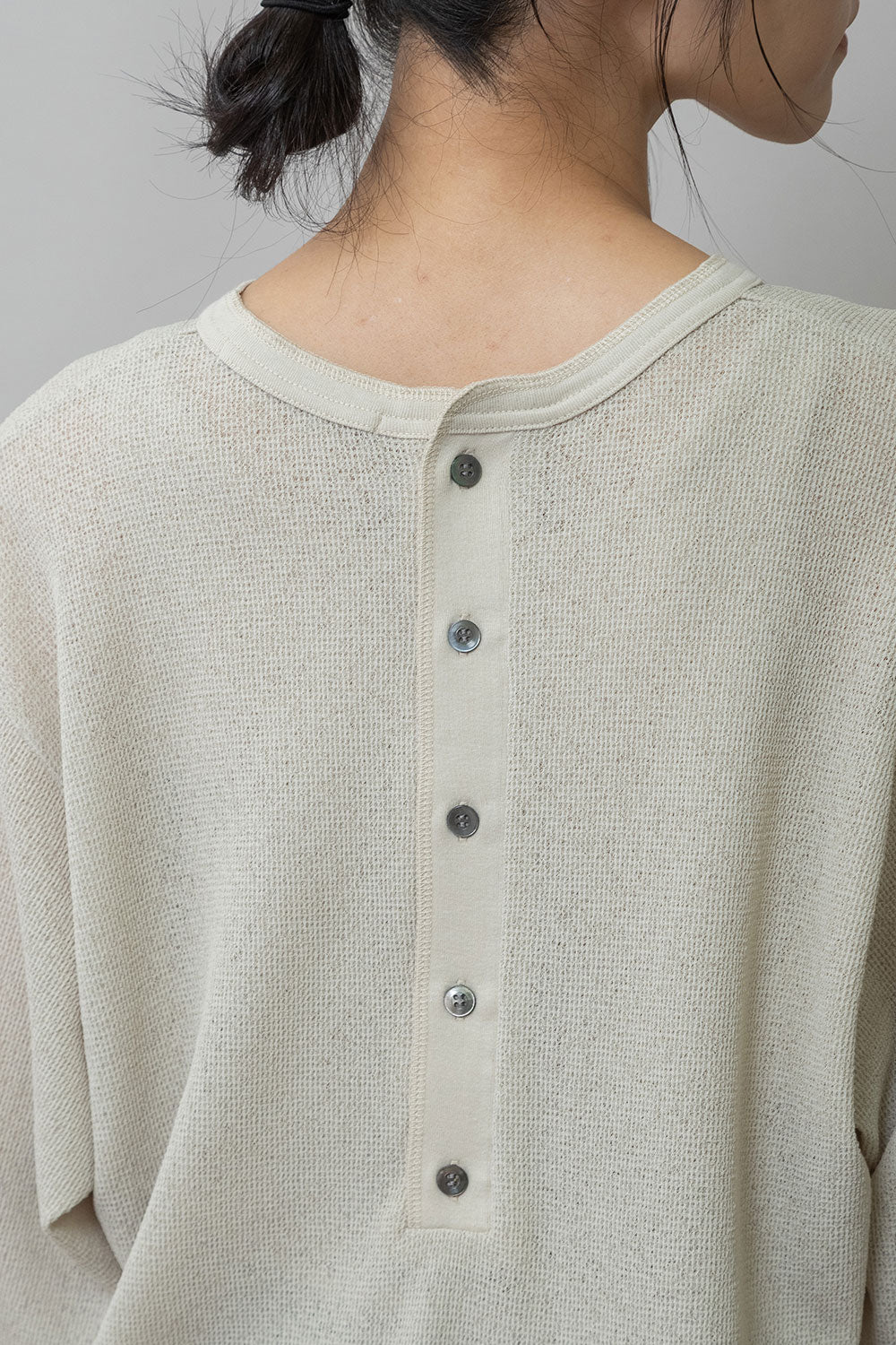 ◆シアーな質感とワッフルの表面感が新しいバックヘンリーネックトップス◆