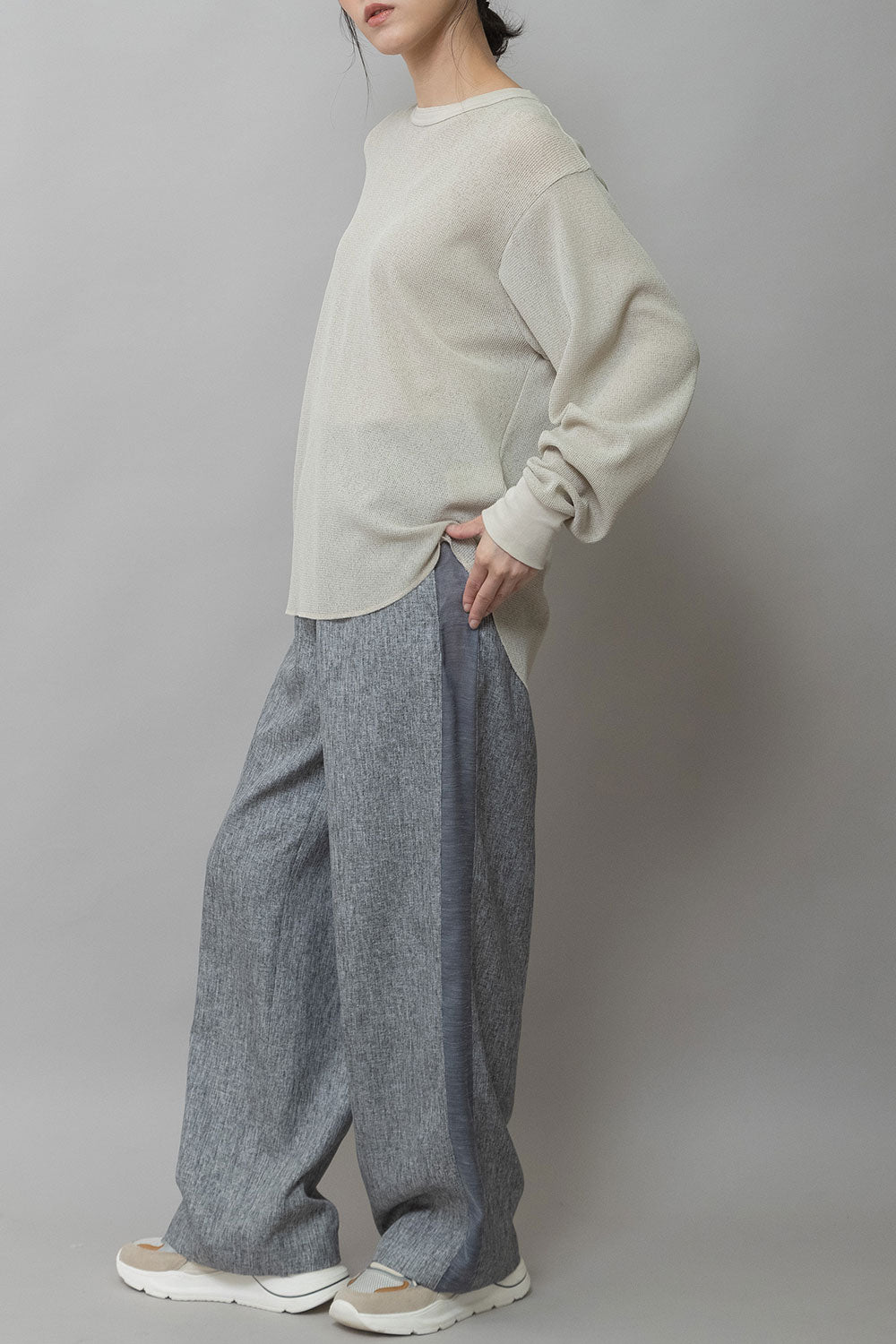 ポリエステル糸の仮撚り度合いをランダムにし、部分的に硬化させることで硬さと柔らかさがミックスされ、麻のようなナチュラルなムラ感のある風合いとキャッチーな素材感が出ています。