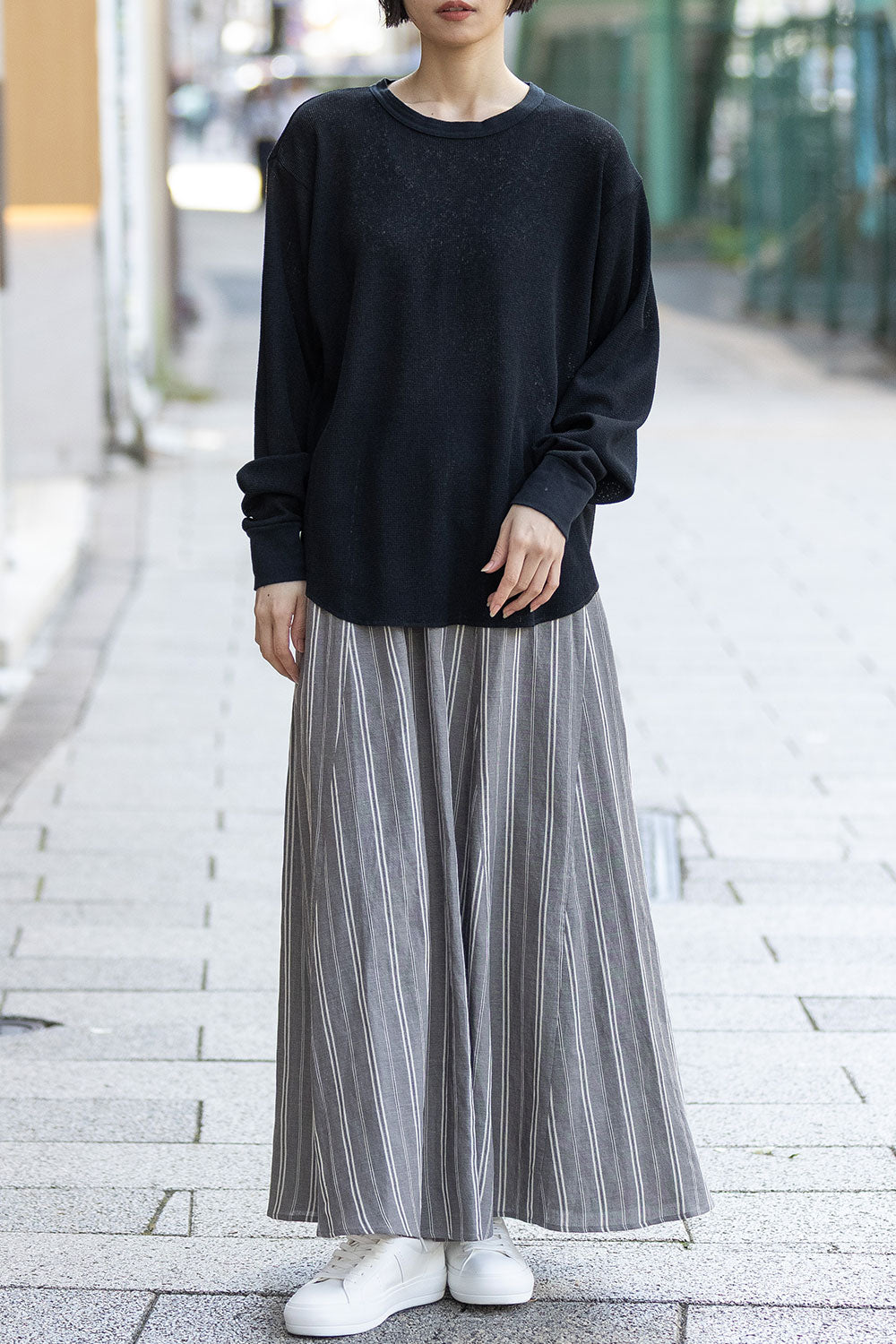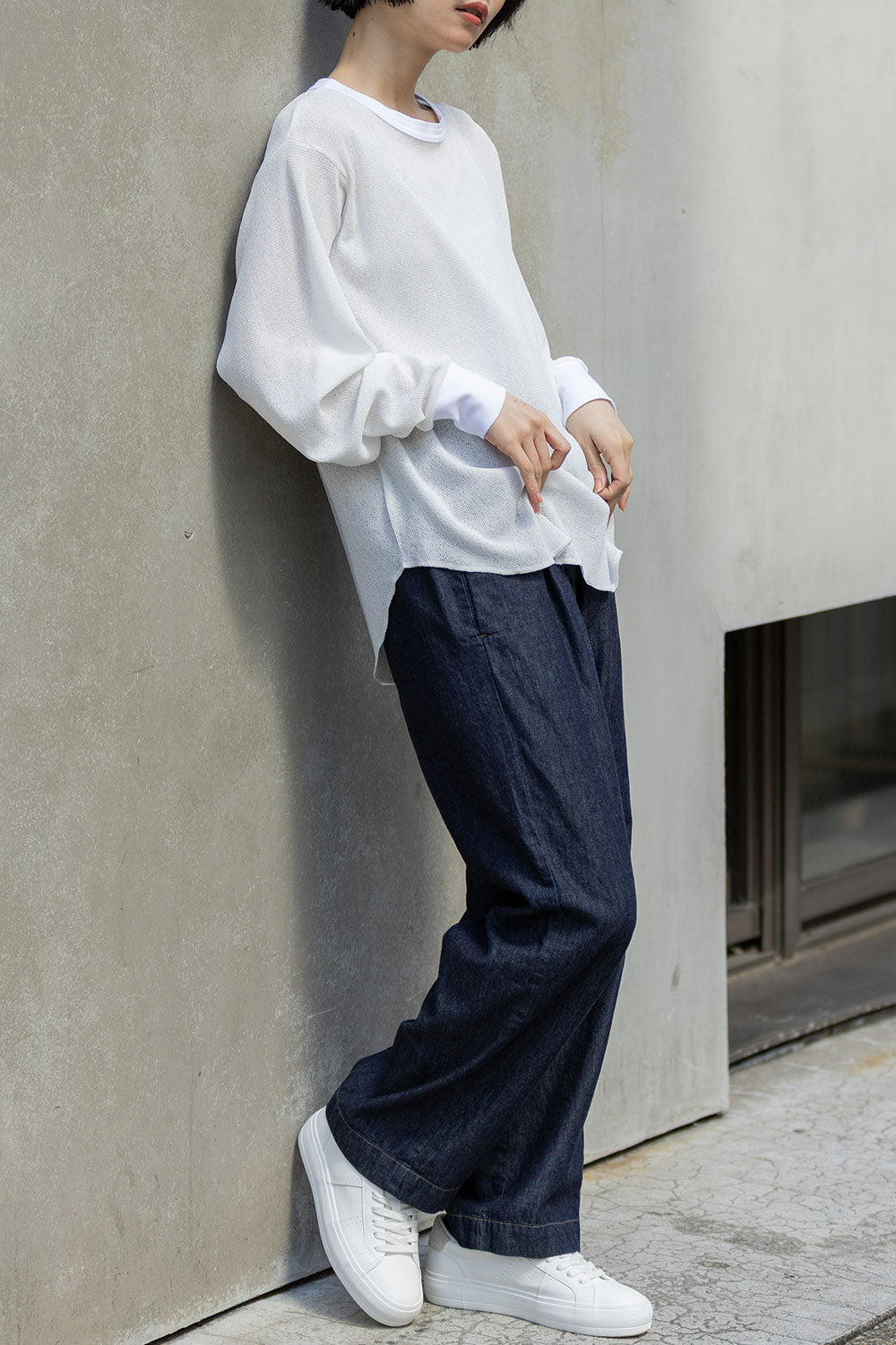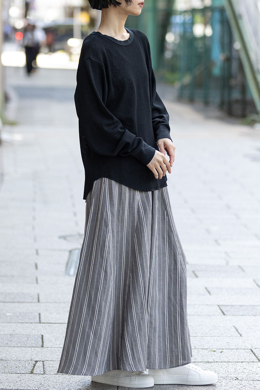 フロントはシンプルに、バックスタイルにボタン開きのデザインを持ってくる事で、抜け感ある大人カジュアルな雰囲気に。
