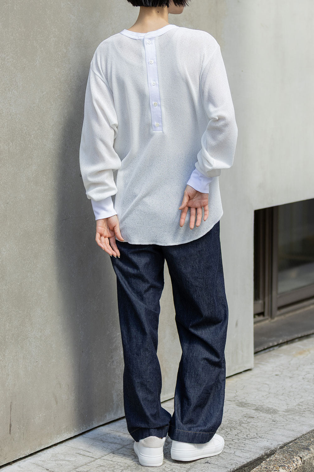 トラディショナルなワッフル素材をシアーで表現したトレンド感ある素材が魅力の、バックヘンリーネックロングスリーブトップス。
