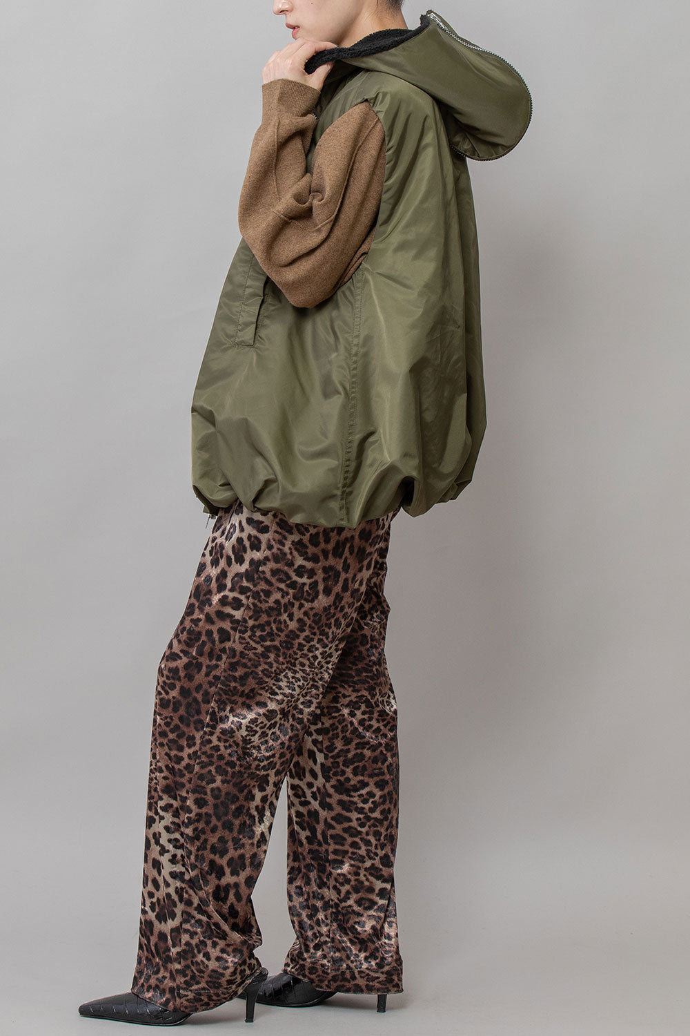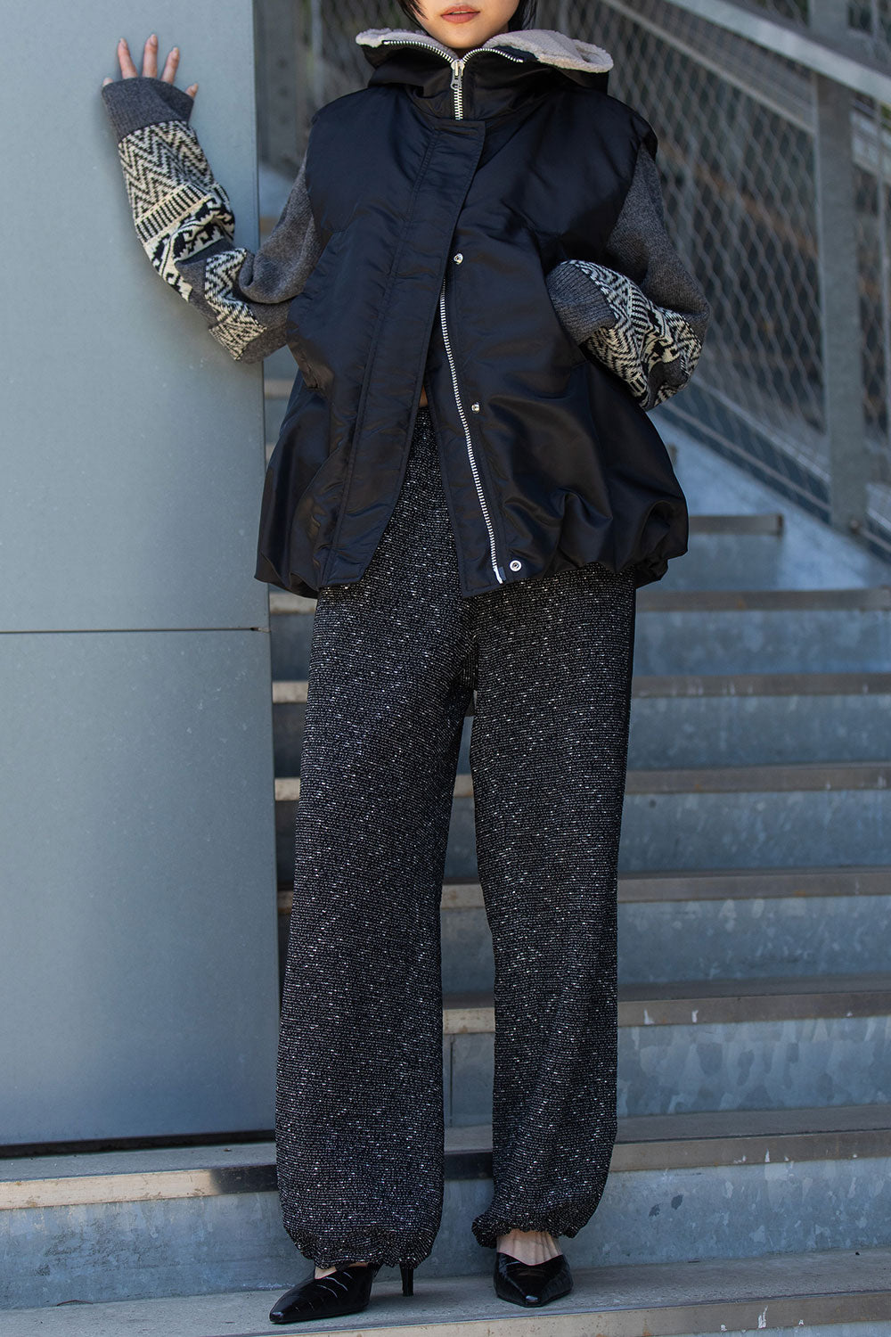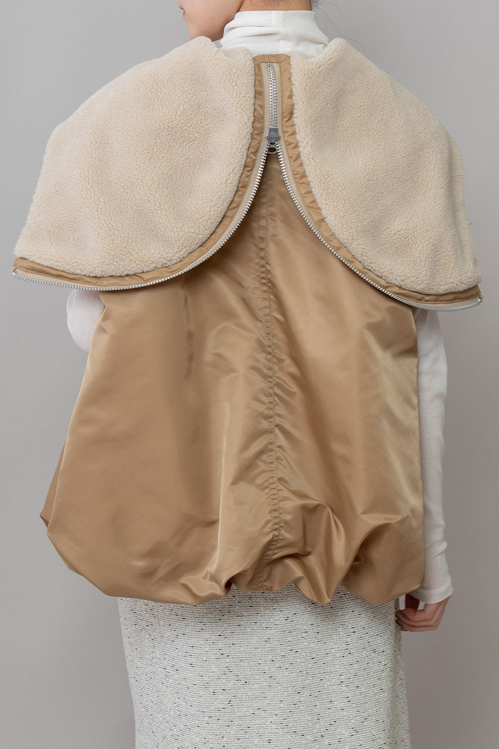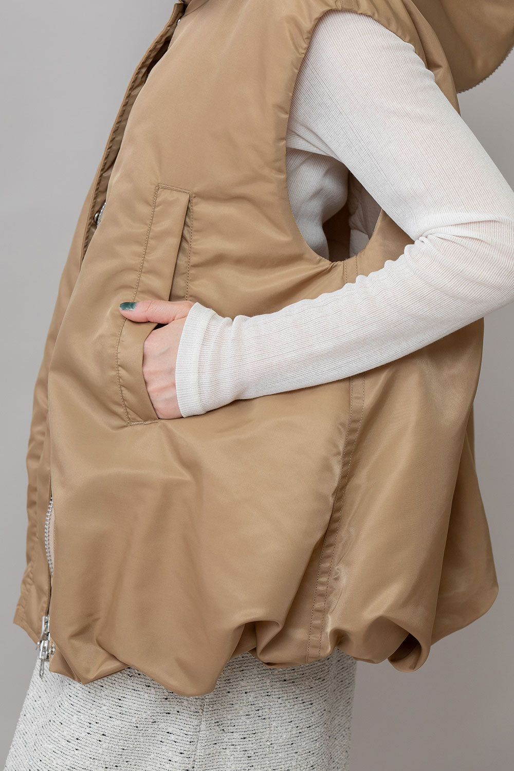 N-2BやN-3Bなどのフライトジャケットをデザインのベースにしたベストで、コールゴムギャザーとタックによるバルーンヘムでシルエットにアクセントを加えました。