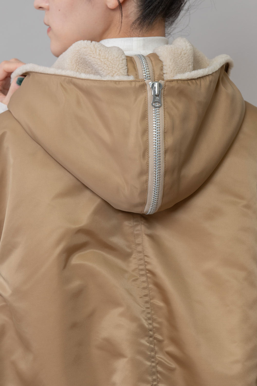 N-2Bの特徴的なディテールであるファスナー付きのスタンドフードはファスナーを大きく開けることでセーラーカラーのように背中側で大きく垂らす着方ができたり、フロントは大型の逆開ファスナー使いなのでスタンドフードは高めに閉じてヘム側は開いたり、着方のアレンジが豊富なアイテムになってます。