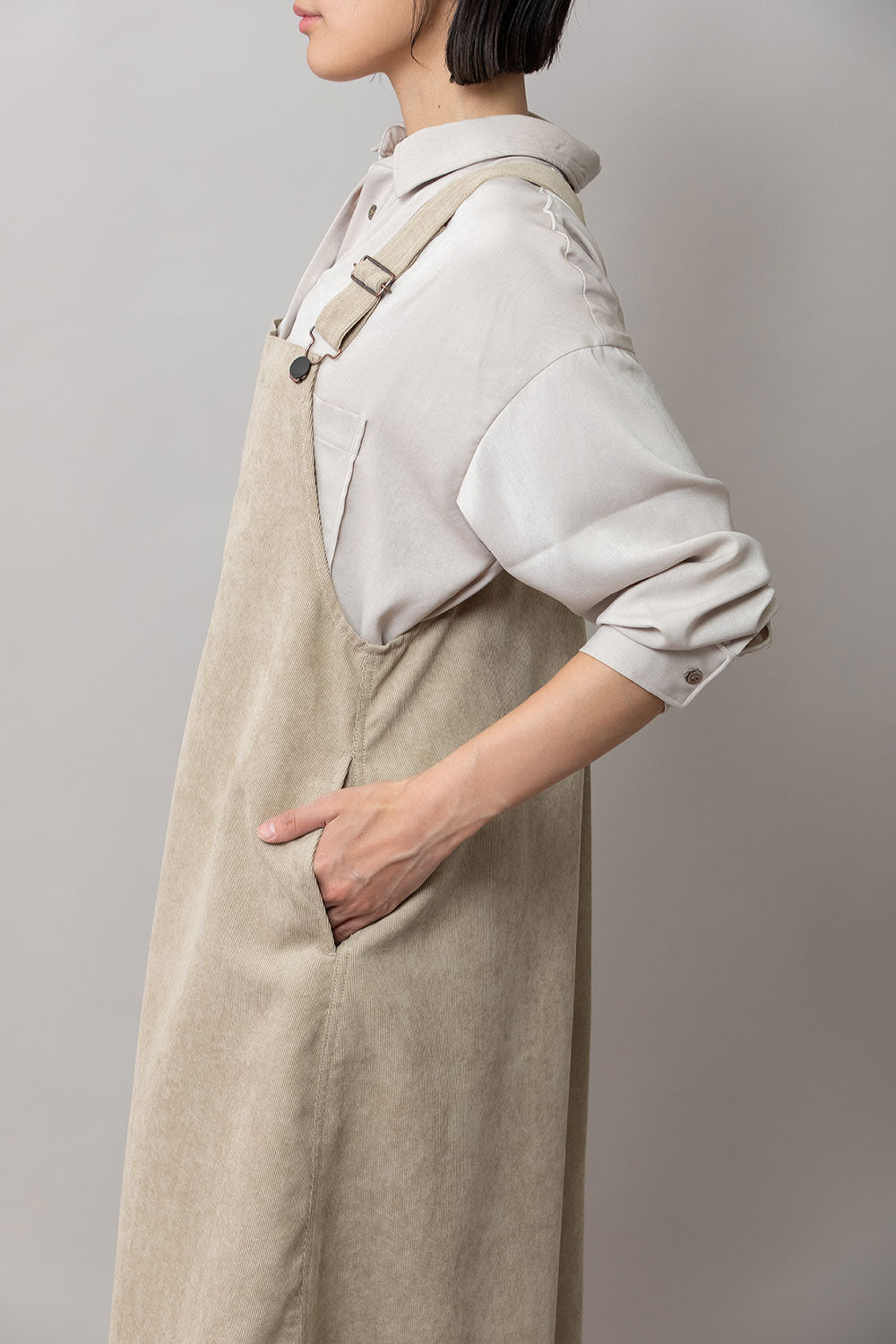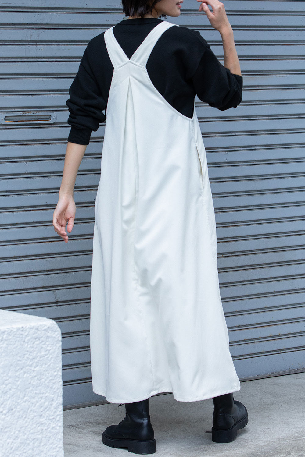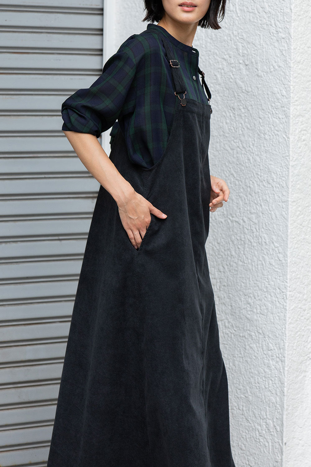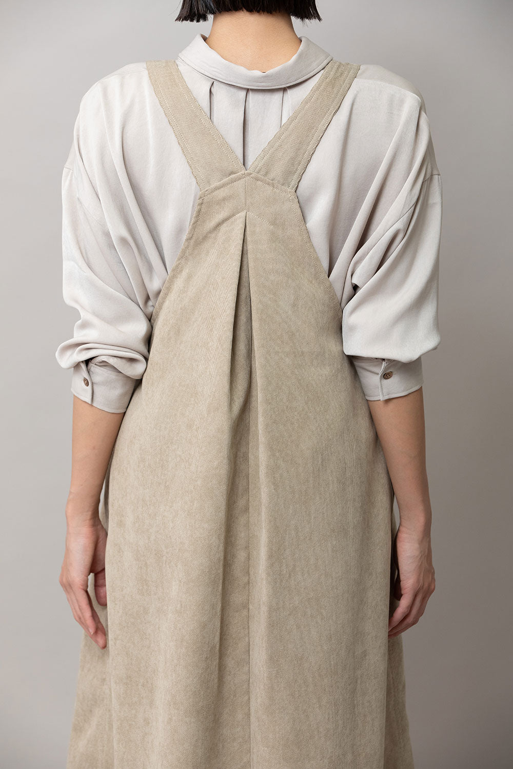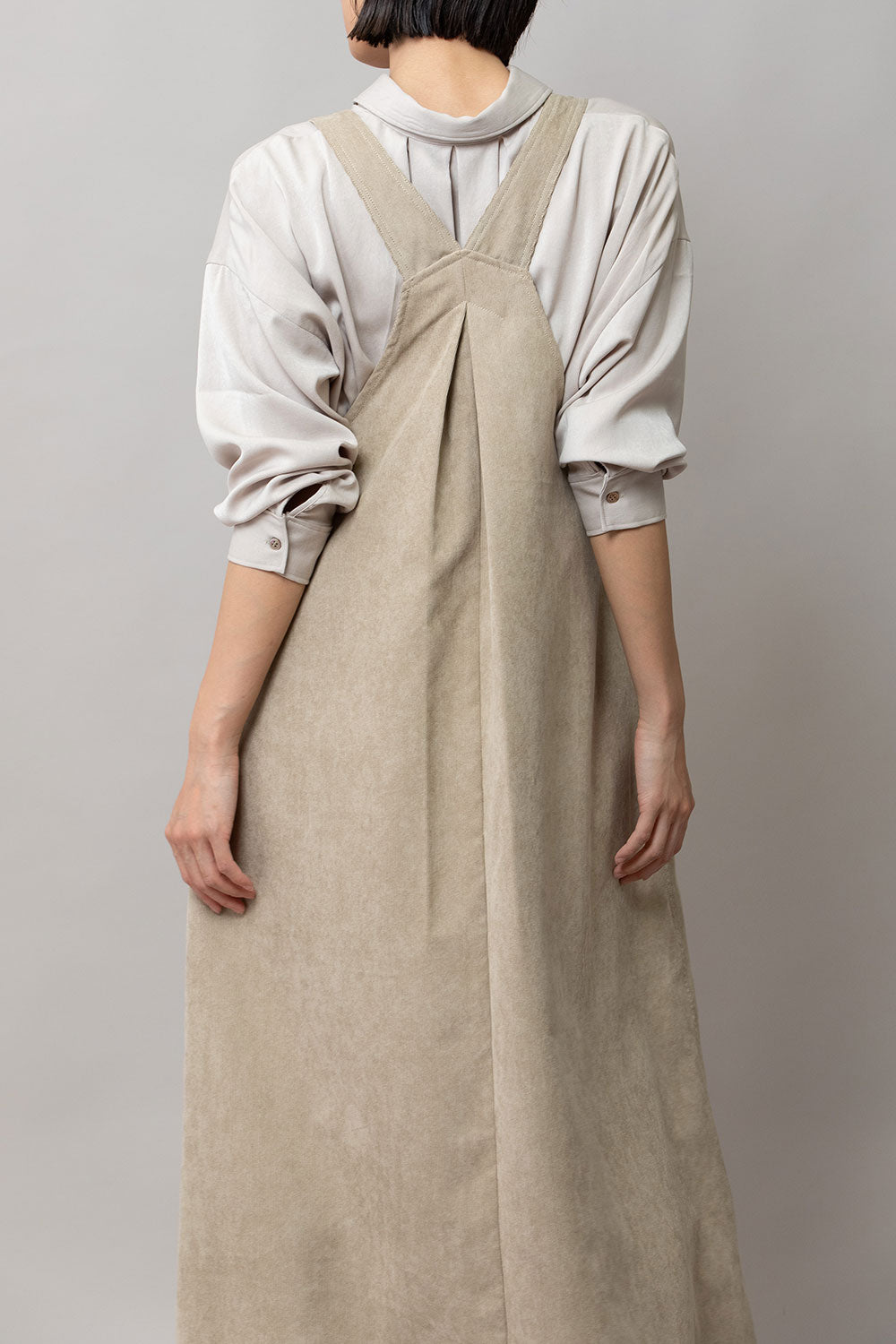 これまで展開をしてきたジャンパースカートはディテールや細かなスペックは違っていても、これまですべてストンとしたIライン寄りの台形パターンだったので、今回のジャンパースカートはNEWシルエットとなっております。