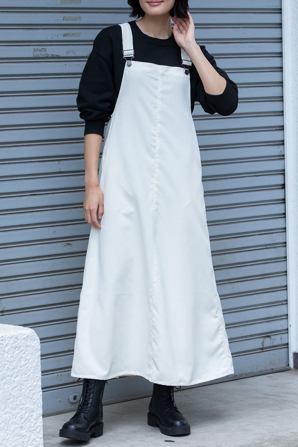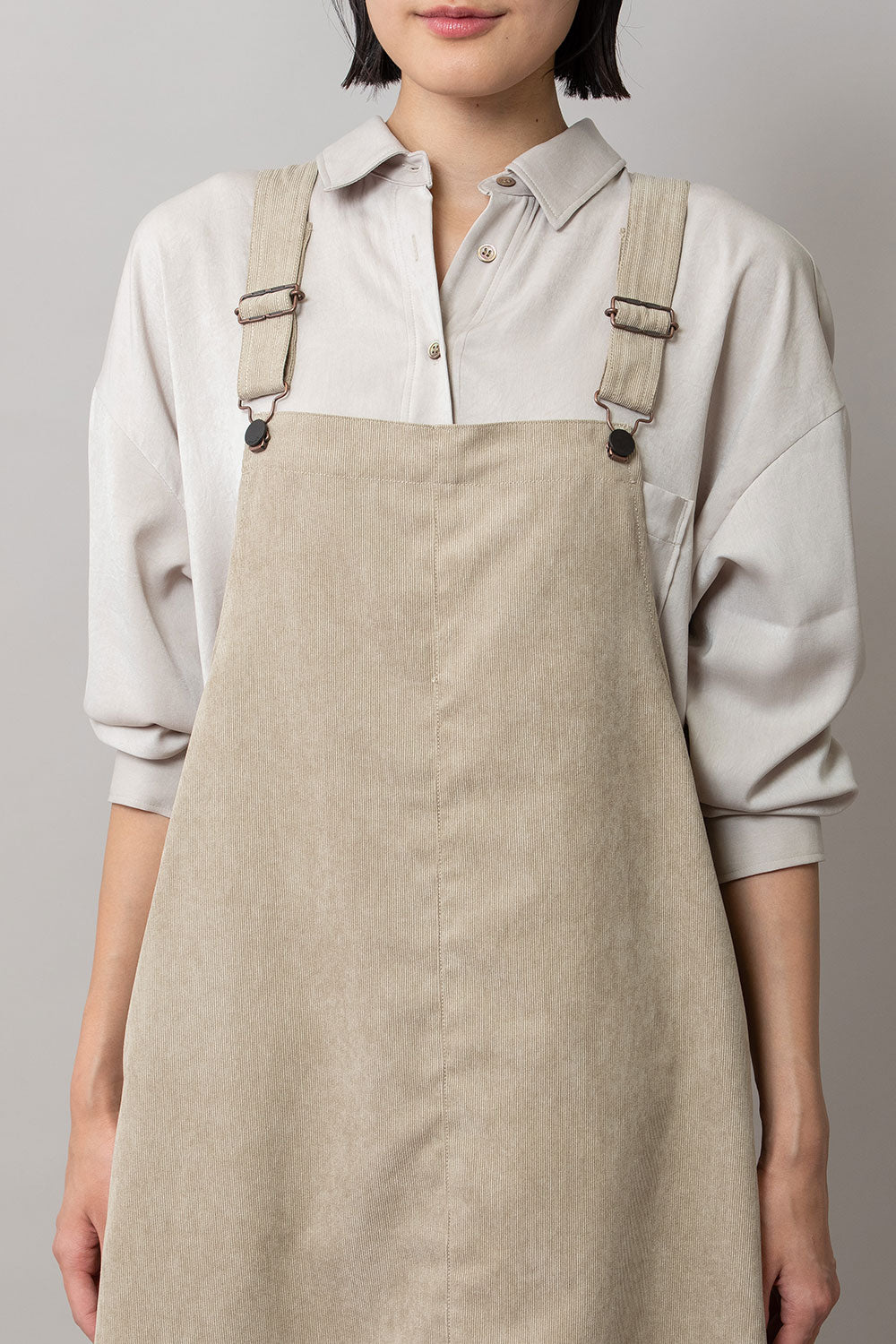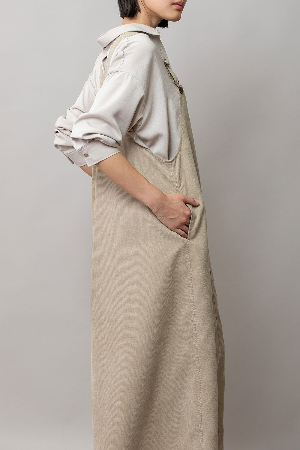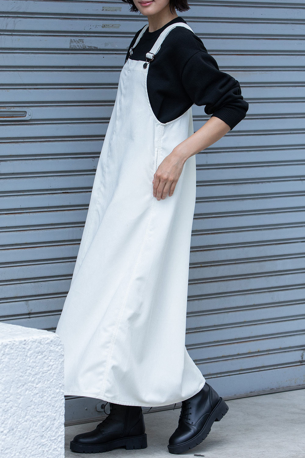 これまで展開をしてきたジャンパースカートはディテールや細かなスペックは違っていても、これまですべてストンとしたIライン寄りの台形パターンだったので、今回のジャンパースカートはNEWシルエットとなっております。