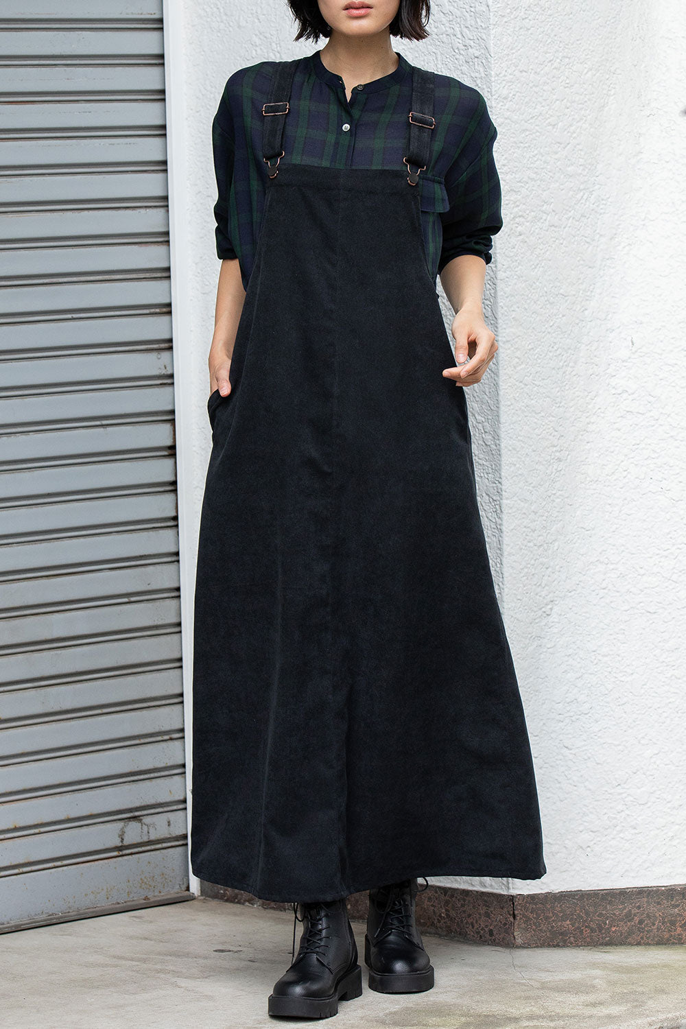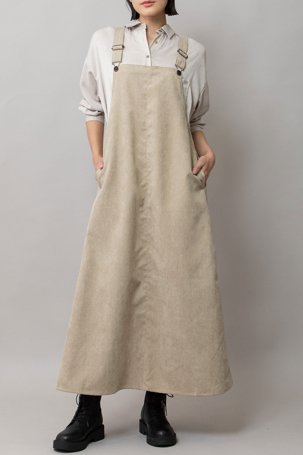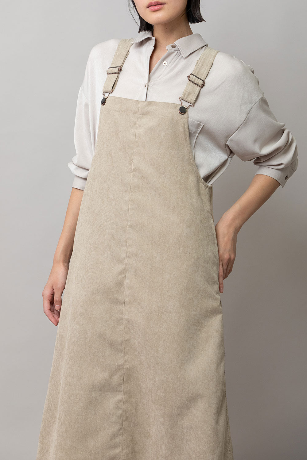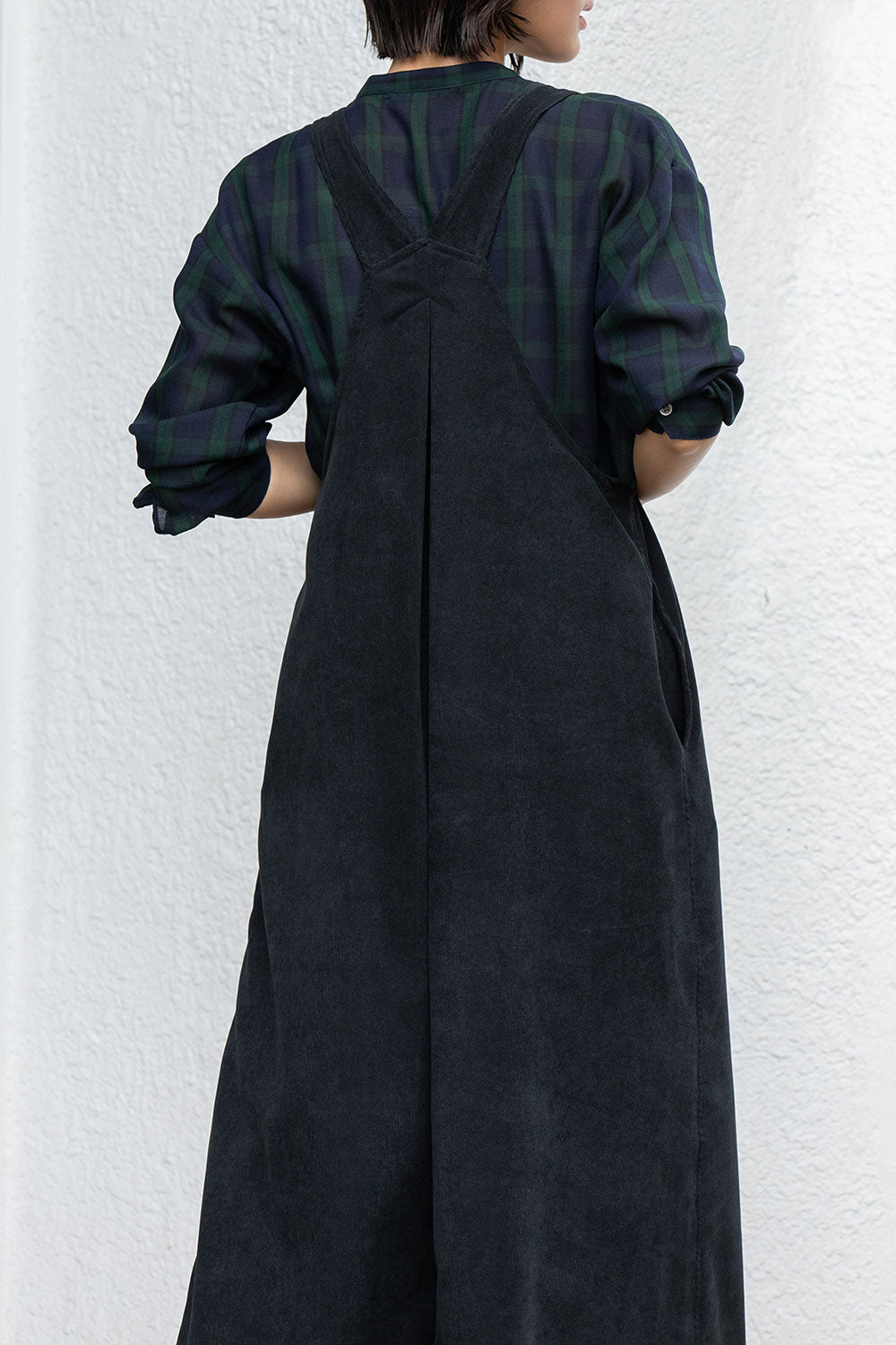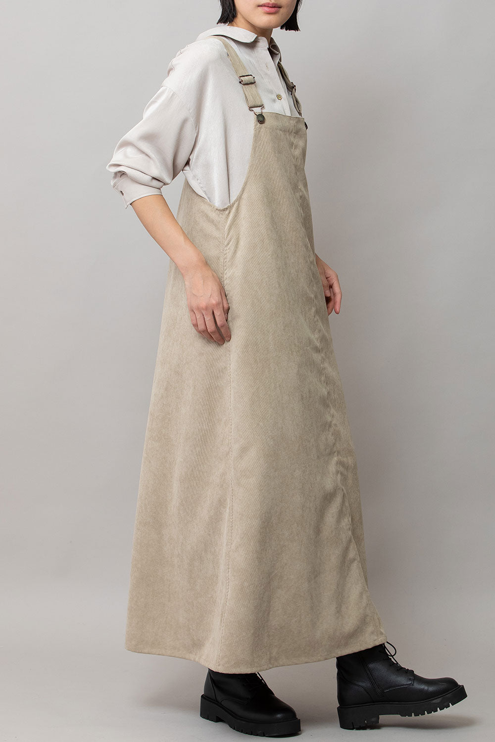 これまで展開をしてきたジャンパースカートはディテールや細かなスペックは違っていても、これまですべてストンとしたIライン寄りの台形パターンだったので、今回のジャンパースカートはNEWシルエットとなっております。