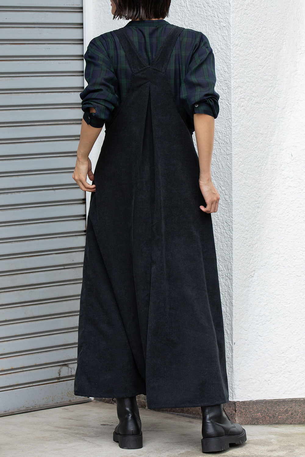 バックにボックスタックをとったキレイなAラインシルエットのジャンパースカートです。