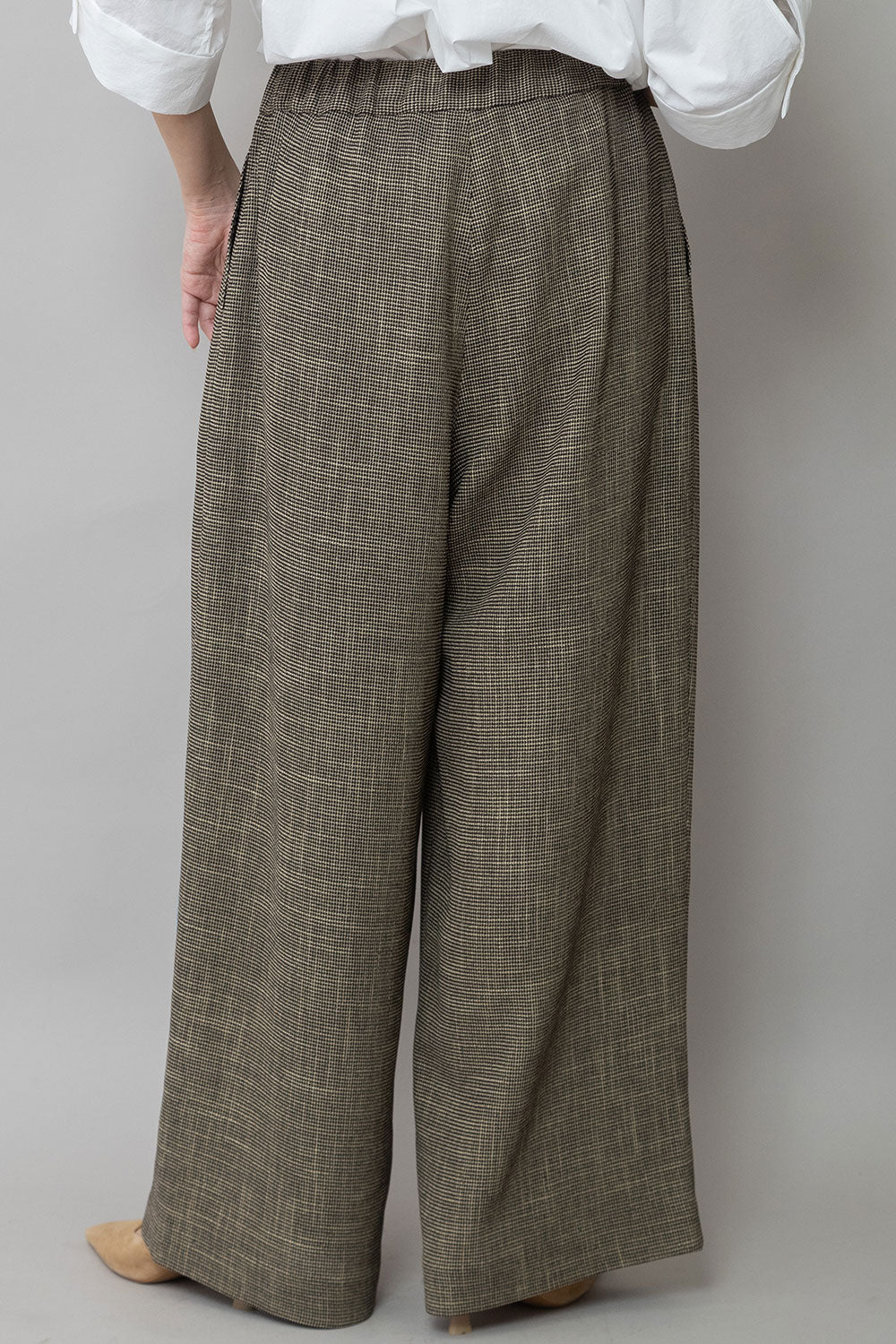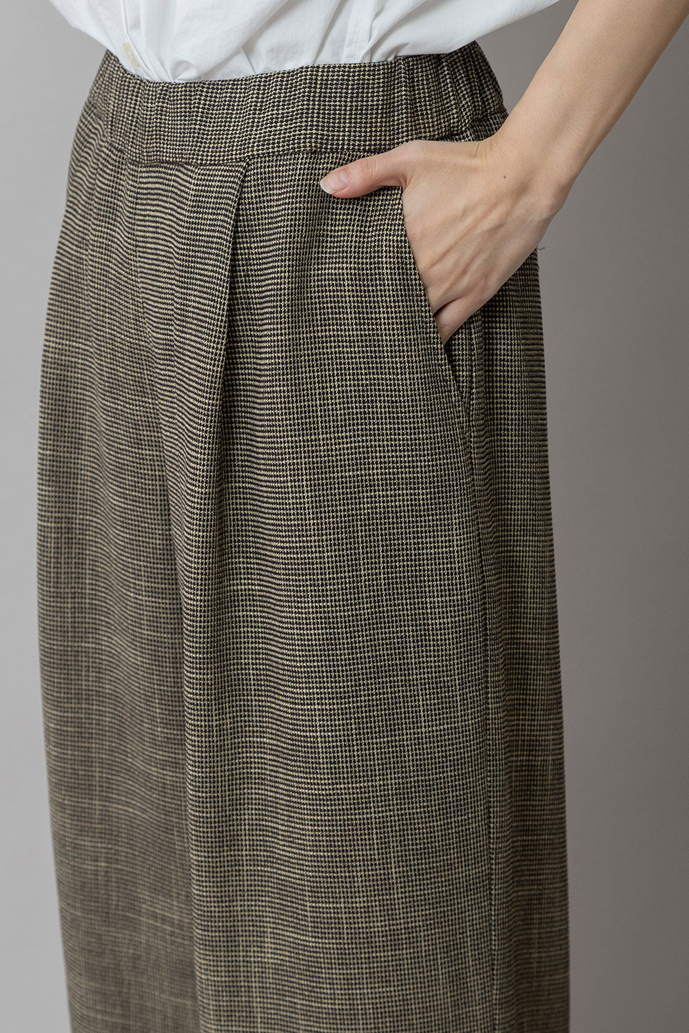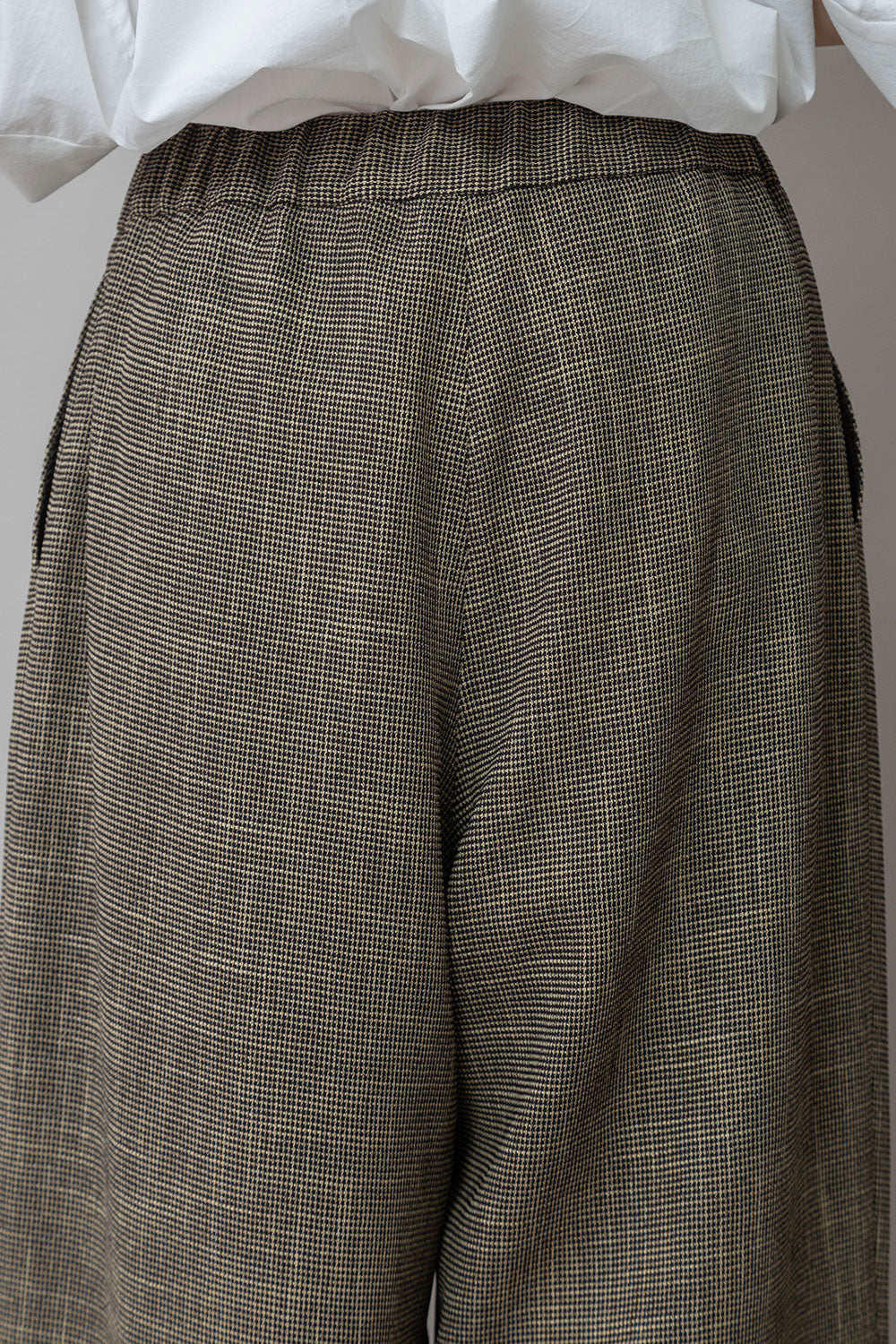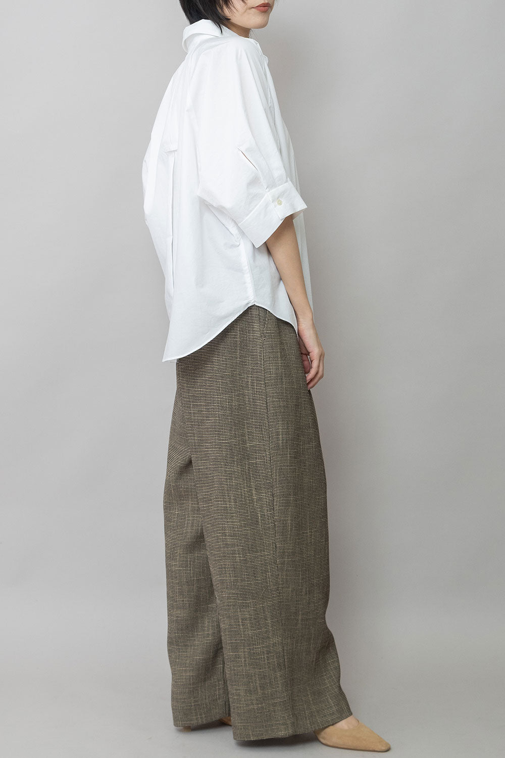 適度にハリとドレープ性を兼ね備えた生地特性によってボリューム感を保ちつつ股下でキレイにドレープが出て、カジュアルながら品のあるワイドシルエットになります。