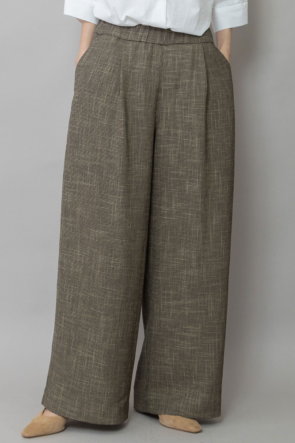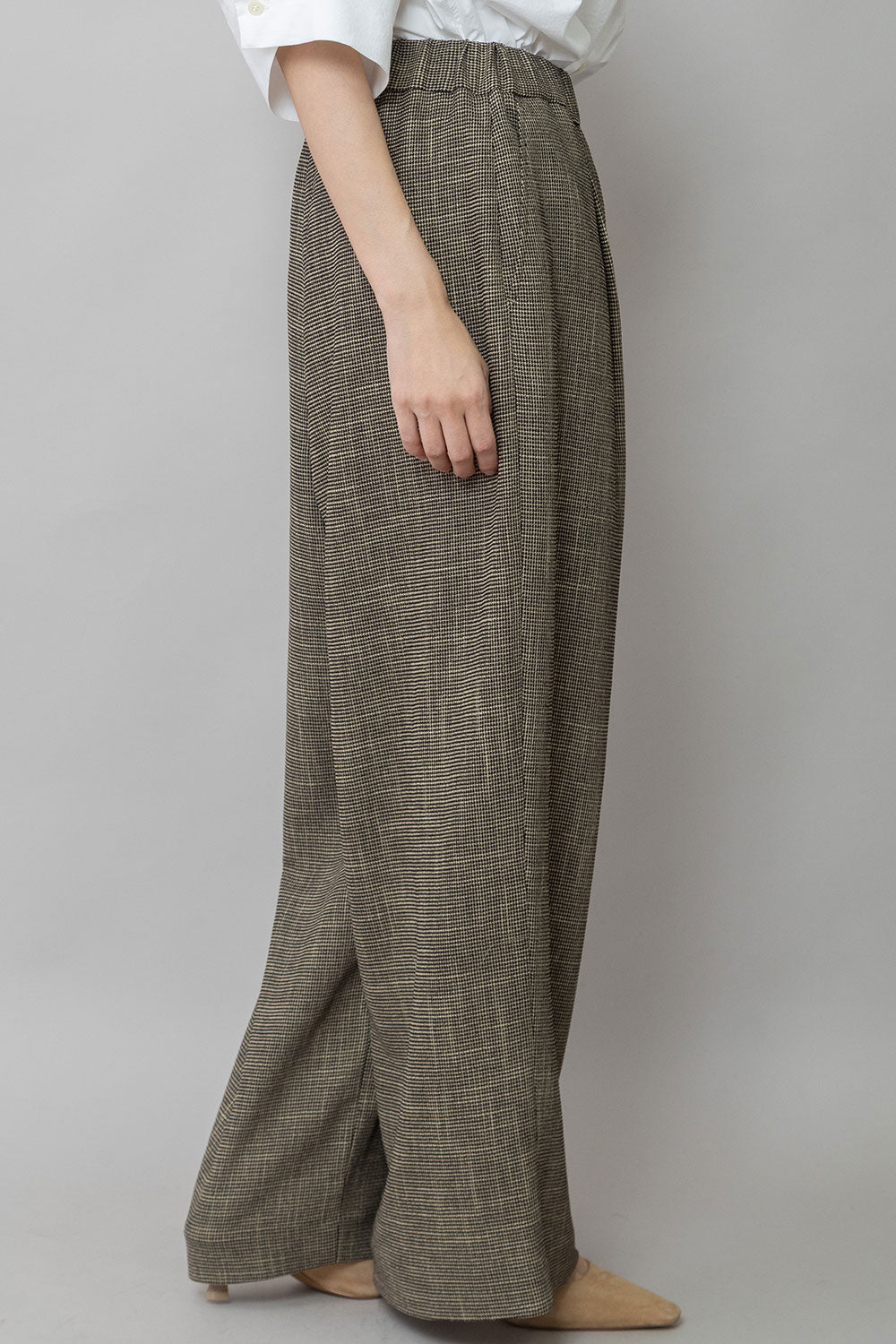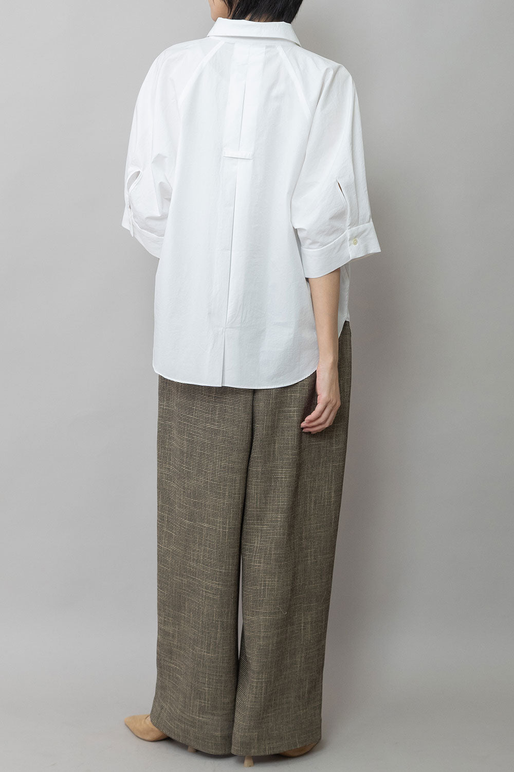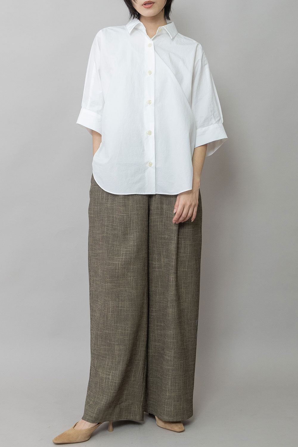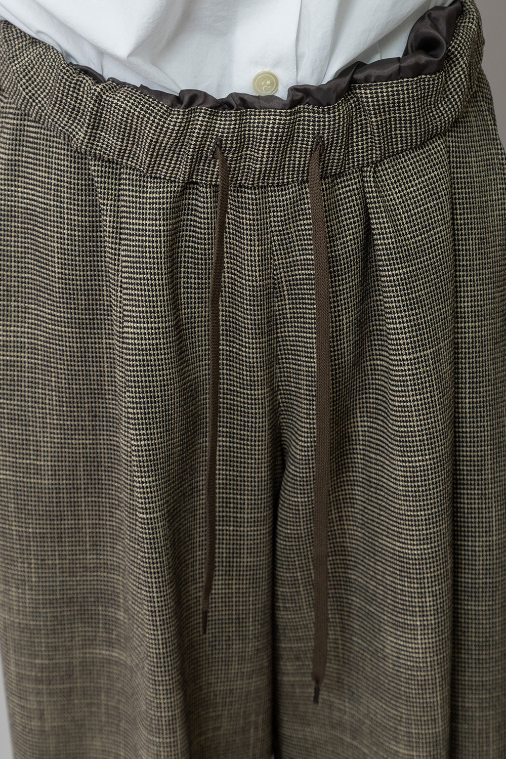 適度にハリとドレープ性を兼ね備えた生地特性によってボリューム感を保ちつつ股下でキレイにドレープが出て、カジュアルながら品のあるワイドシルエットになります。