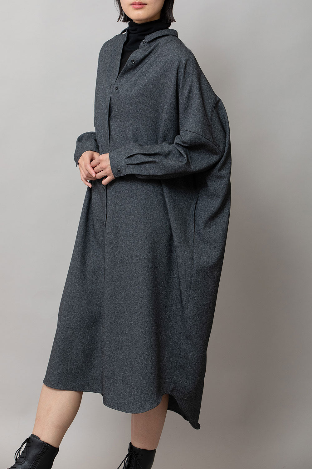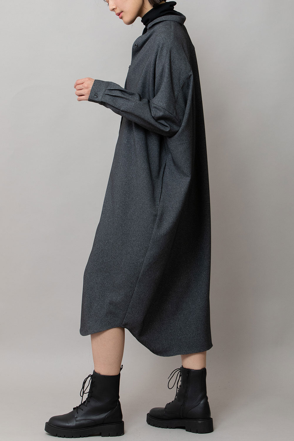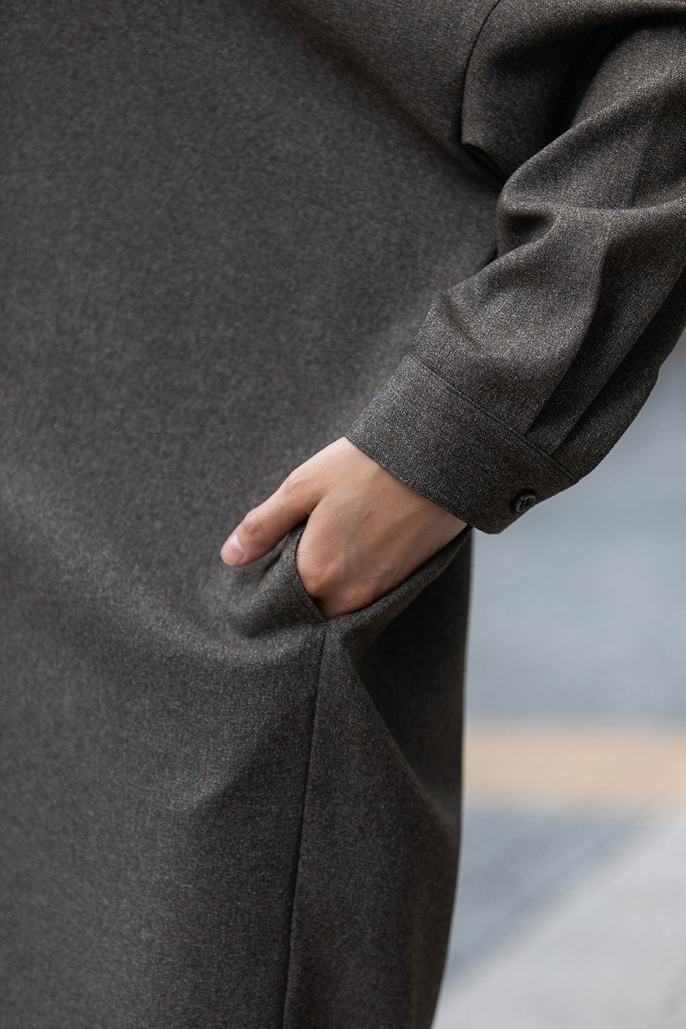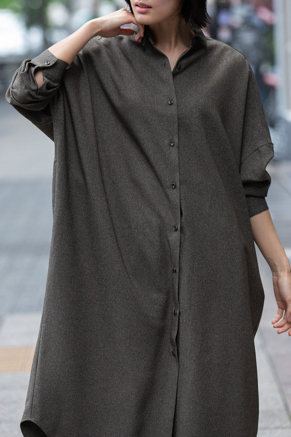 ◆ウールライクなメランジ調ツイルで、羽織りにも使えるゆったりシルエットのカジュアルワンピース◆