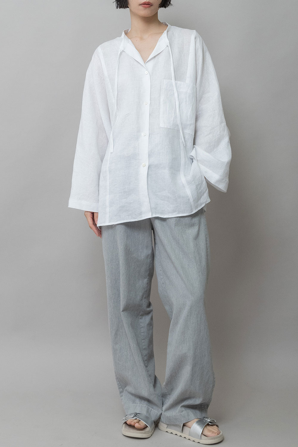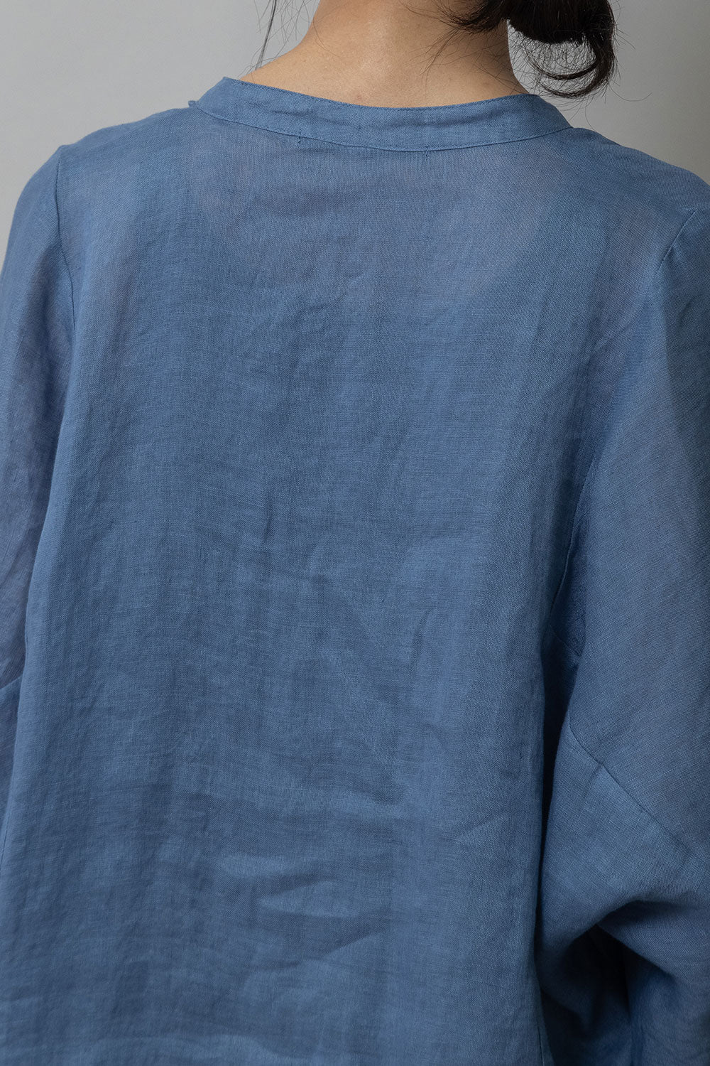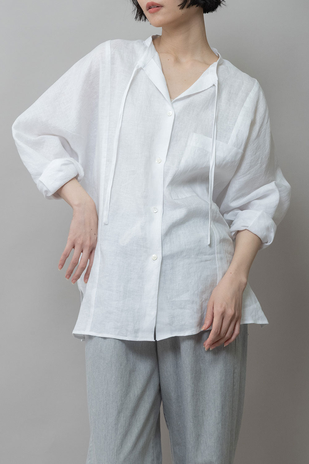ゆったりしたドルマンスリーブのシャツで衿はバンドカラーのような低めの衿に共地コードを挟み込んでいます。