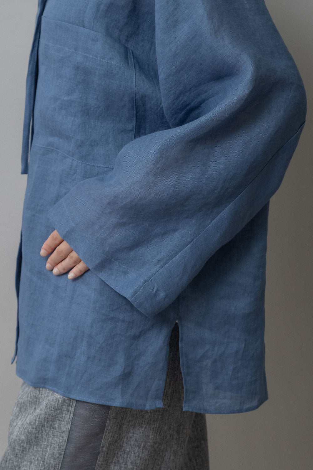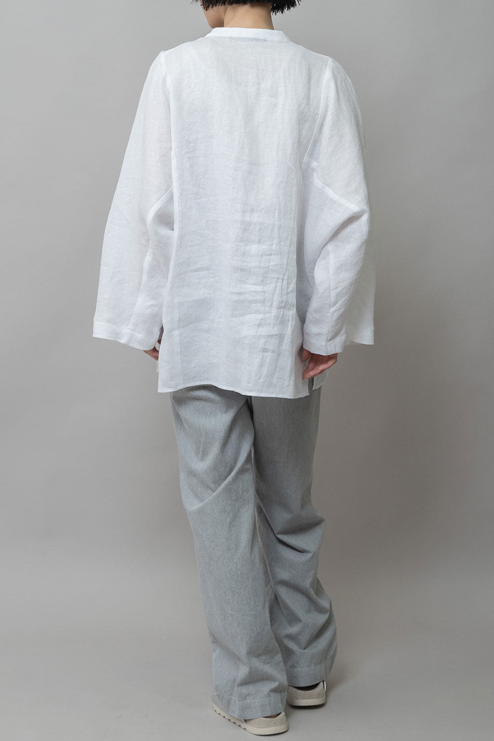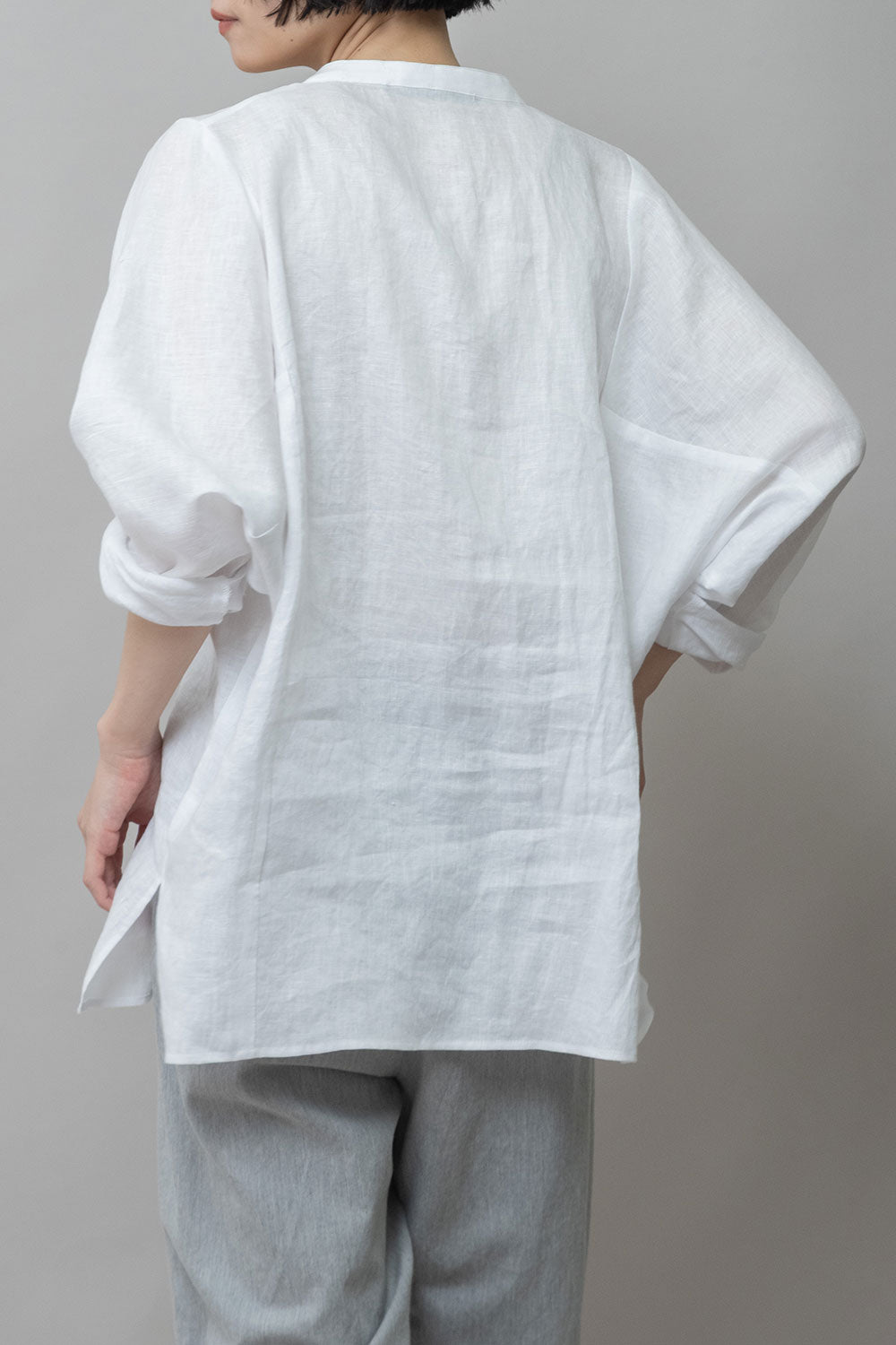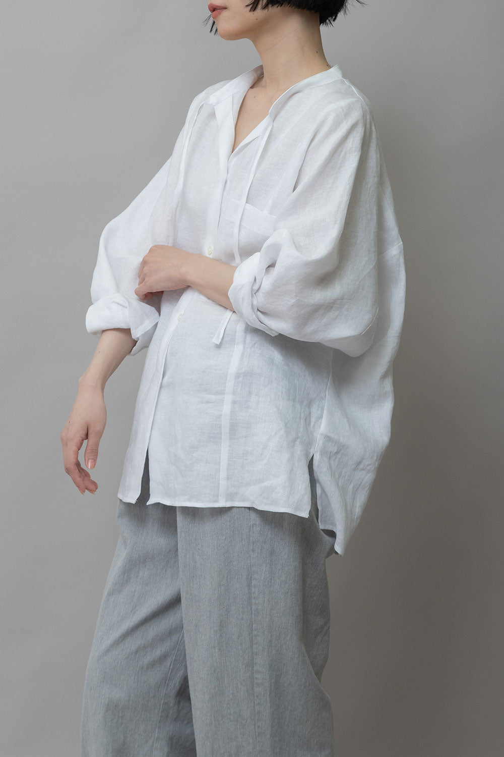 身頃の切り替えがちょうど浅めの肩幅くらいのところにくるのでゆったりしていながら少し華奢な雰囲気の出せる切替えになっていて、カフスの無い太めの筒袖はタックをとってロールアップすることで前腕(肘下)のところで止まるように捲れます。