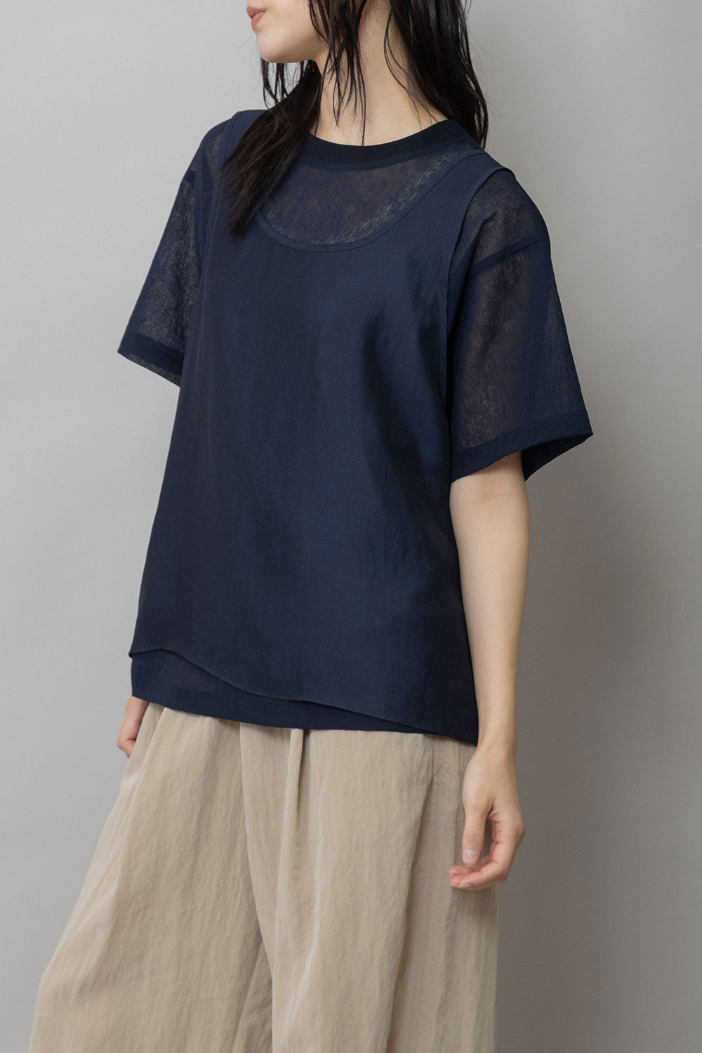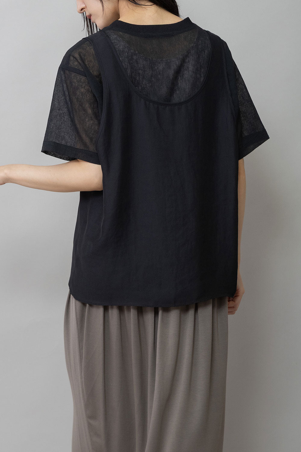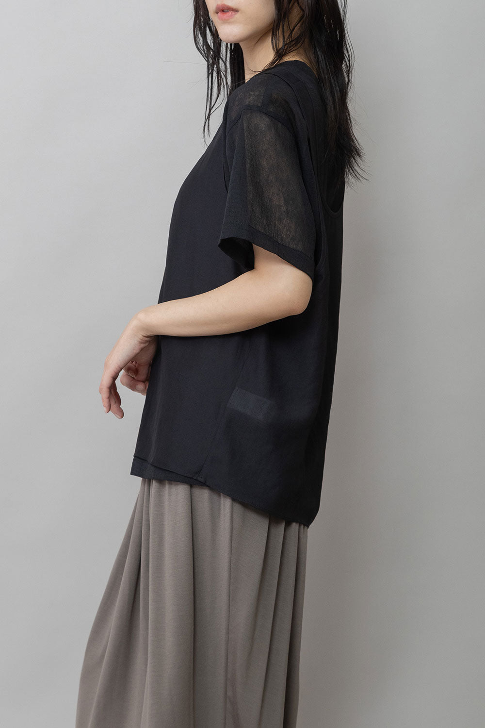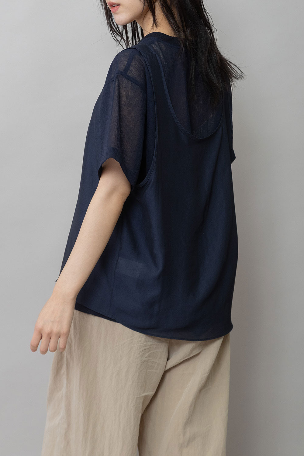 シルクライクなフィブリル感のあるタンクトップとシアーなTシャツの組み合わせを布帛ならではのエアリーなゆるいシルエットでまとめたトップスです。