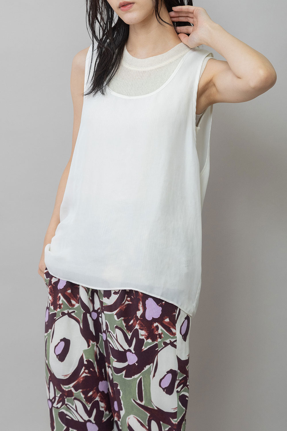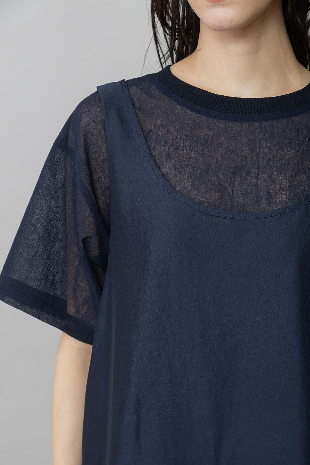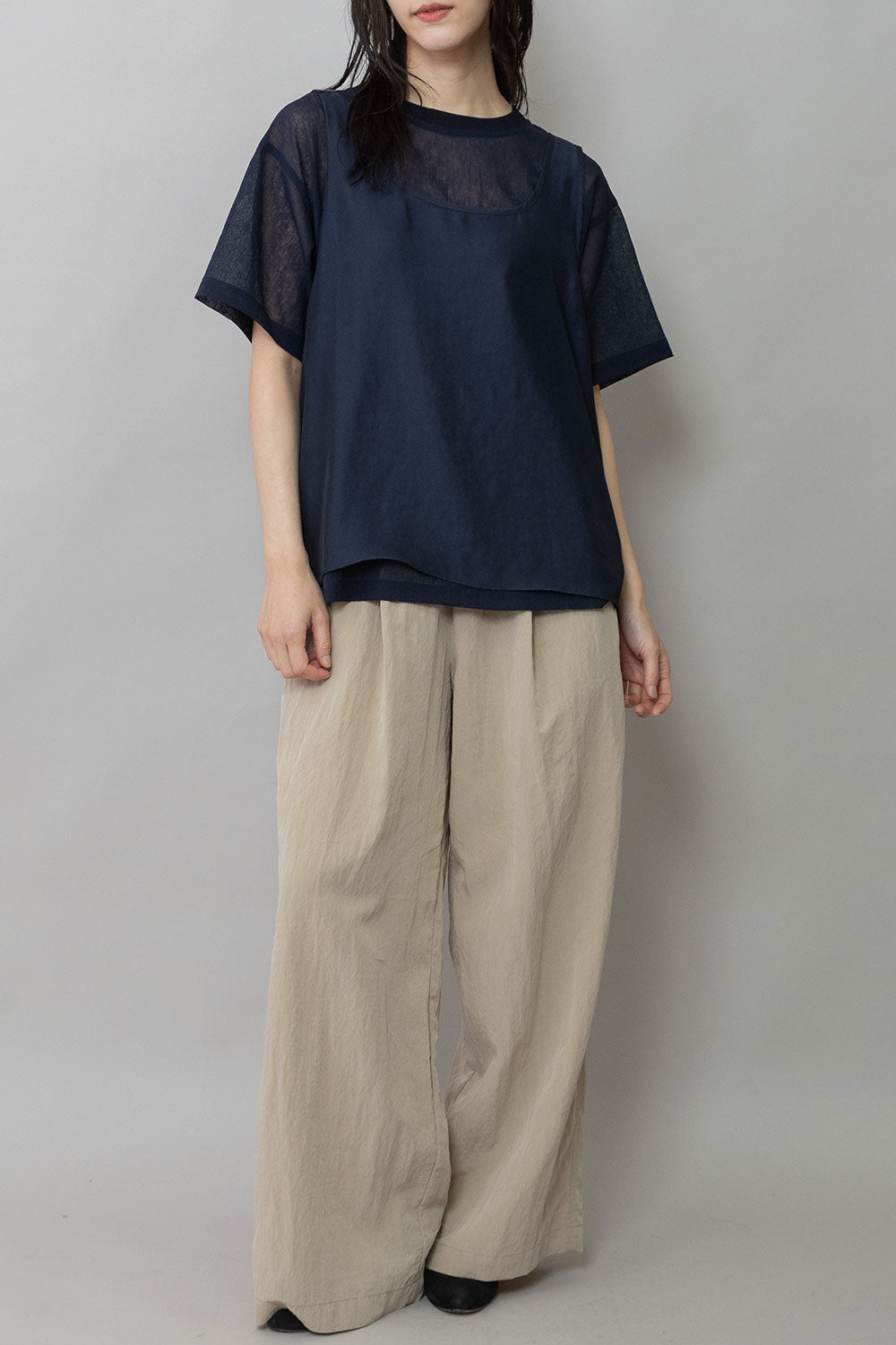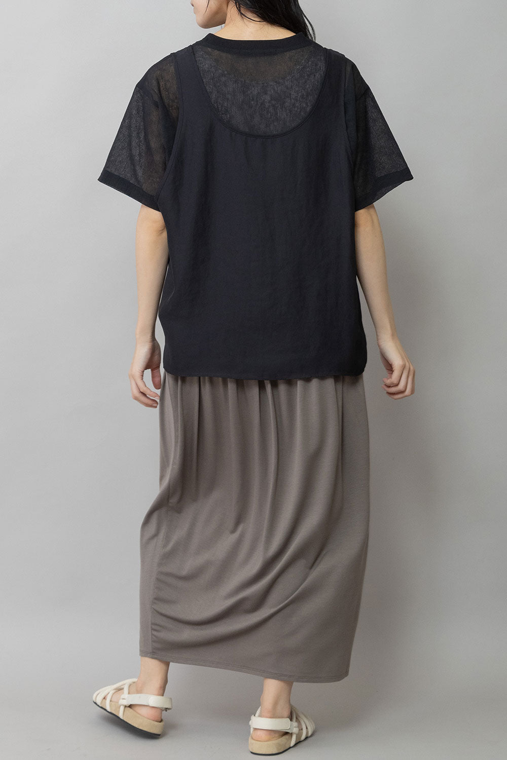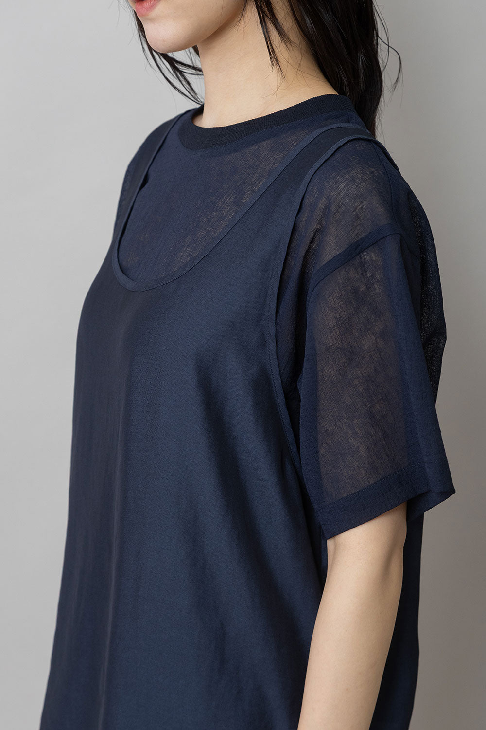 シルクライクなフィブリル感のあるタンクトップとシアーなTシャツの組み合わせを布帛ならではのエアリーなゆるいシルエットでまとめたトップスです。