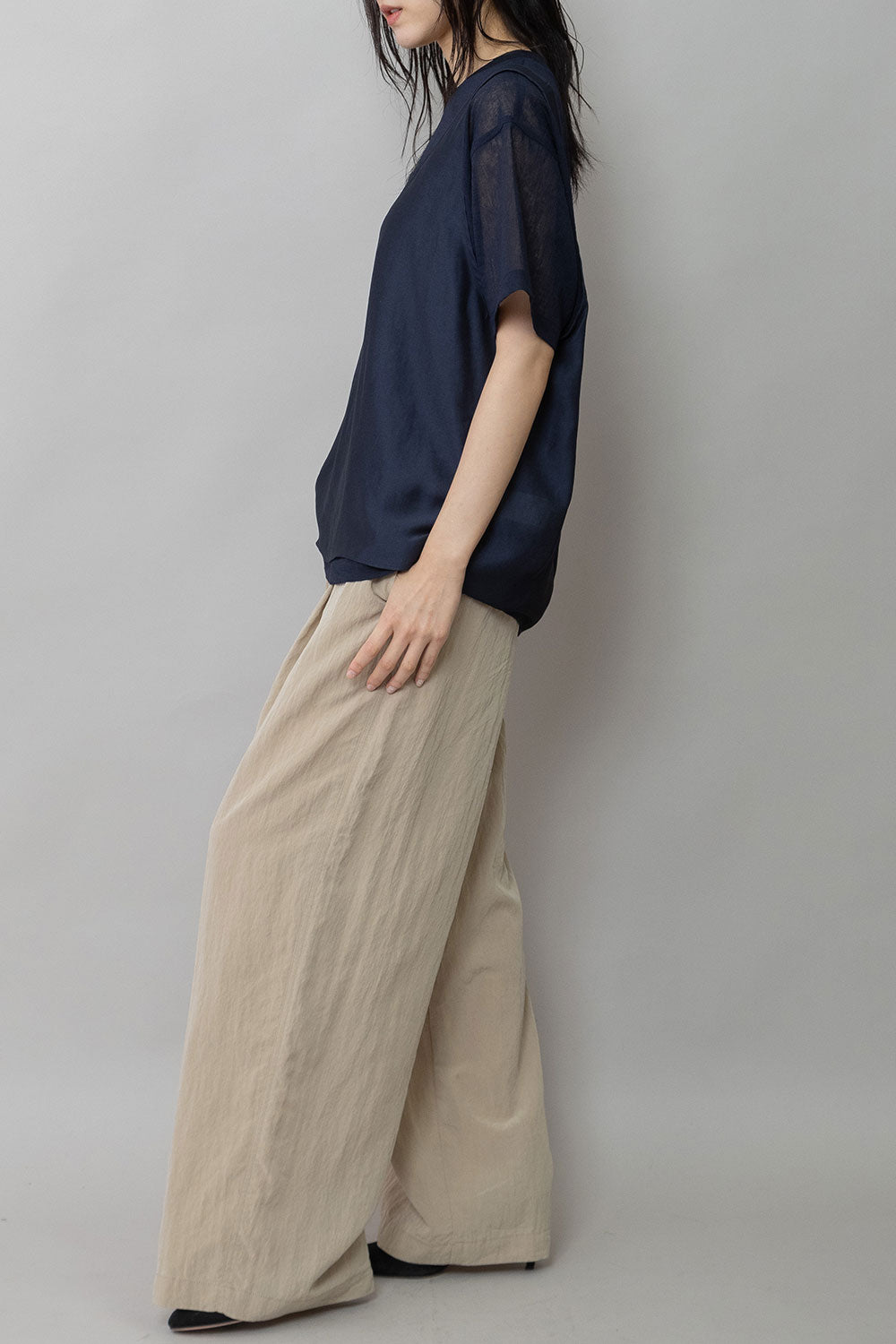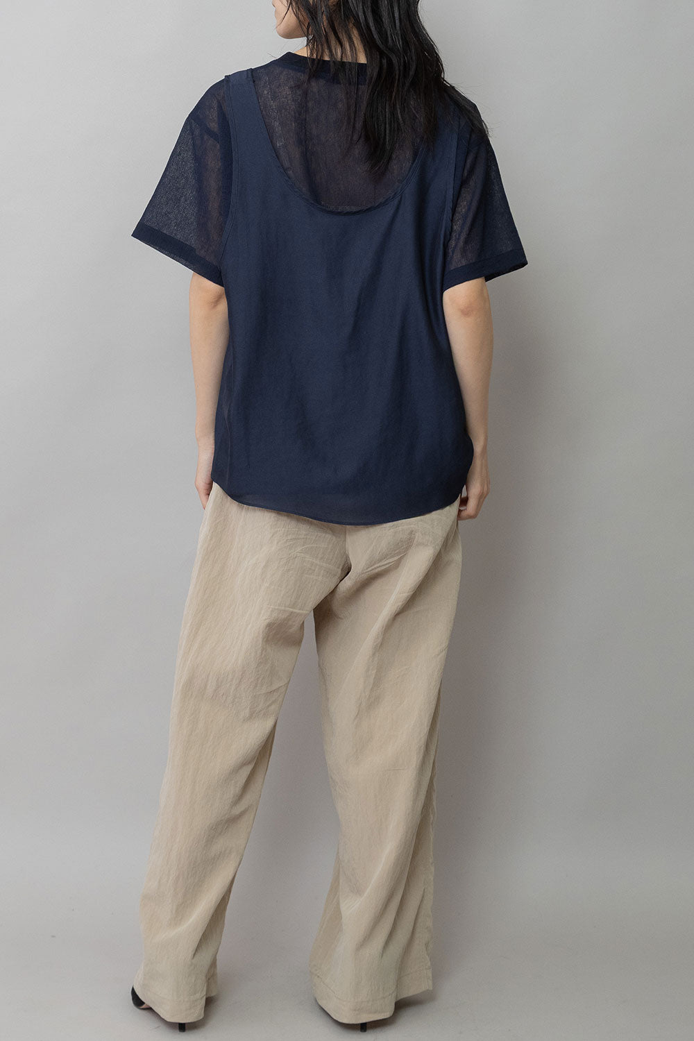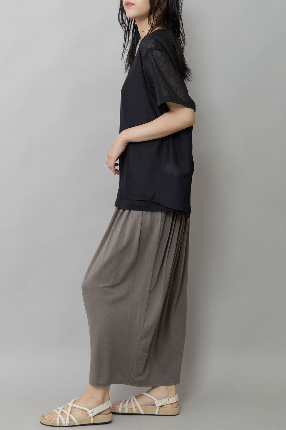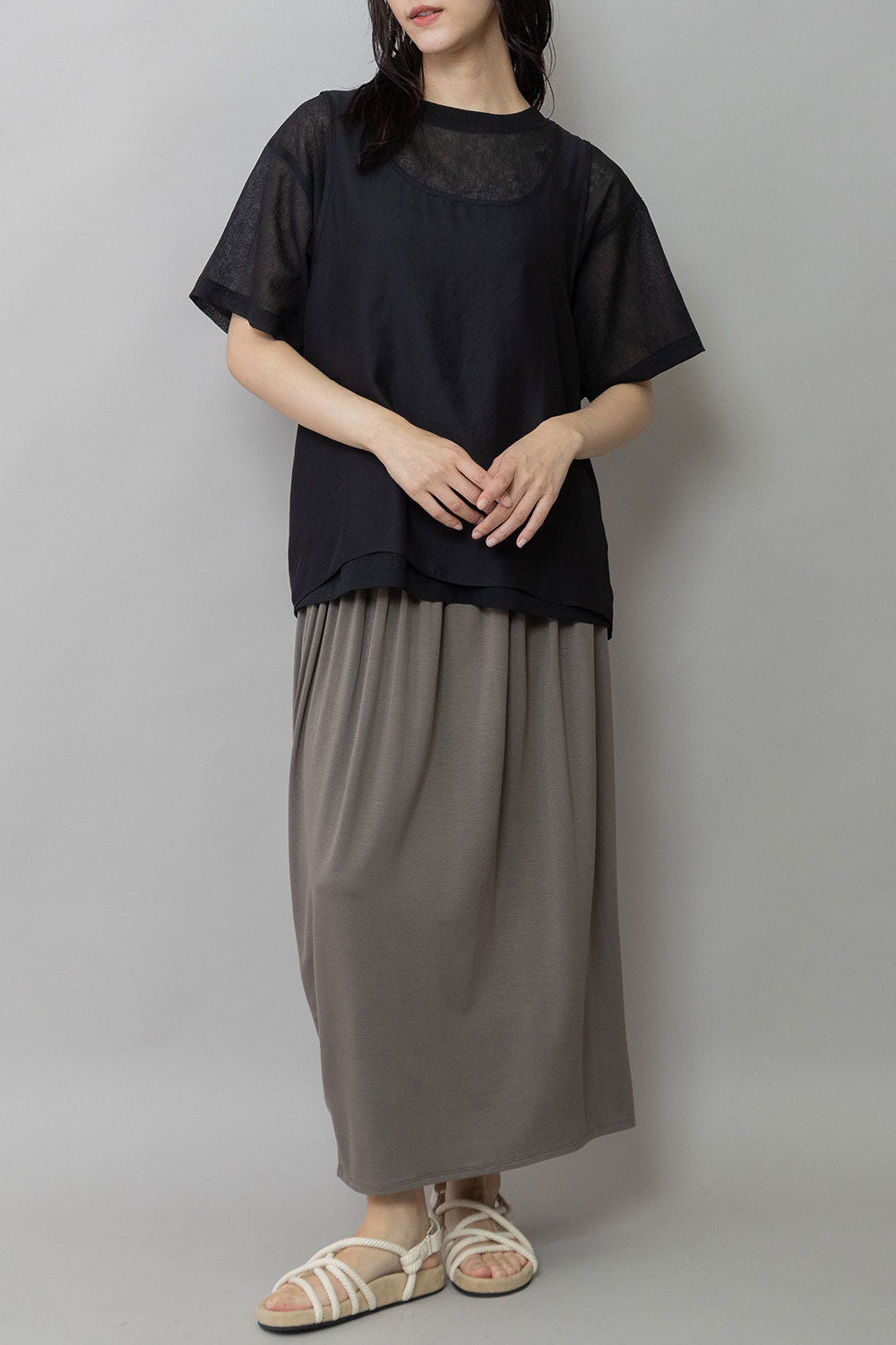 シルクライクなフィブリル感のあるタンクトップとシアーなTシャツの組み合わせを布帛ならではのエアリーなゆるいシルエットでまとめたトップスです。