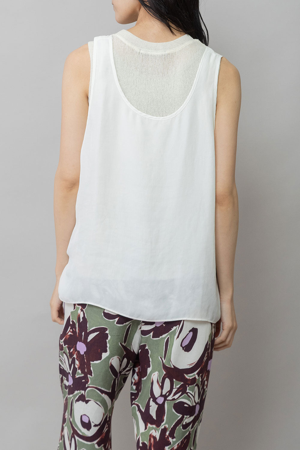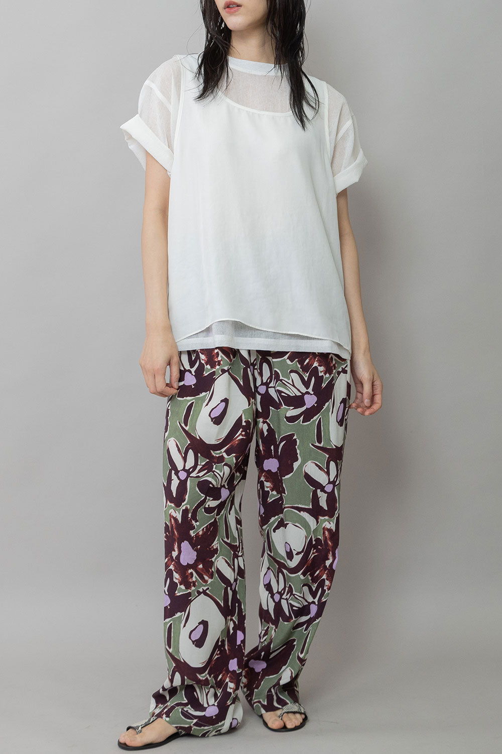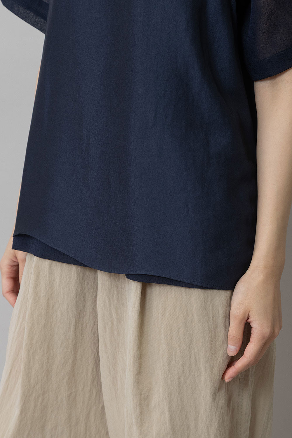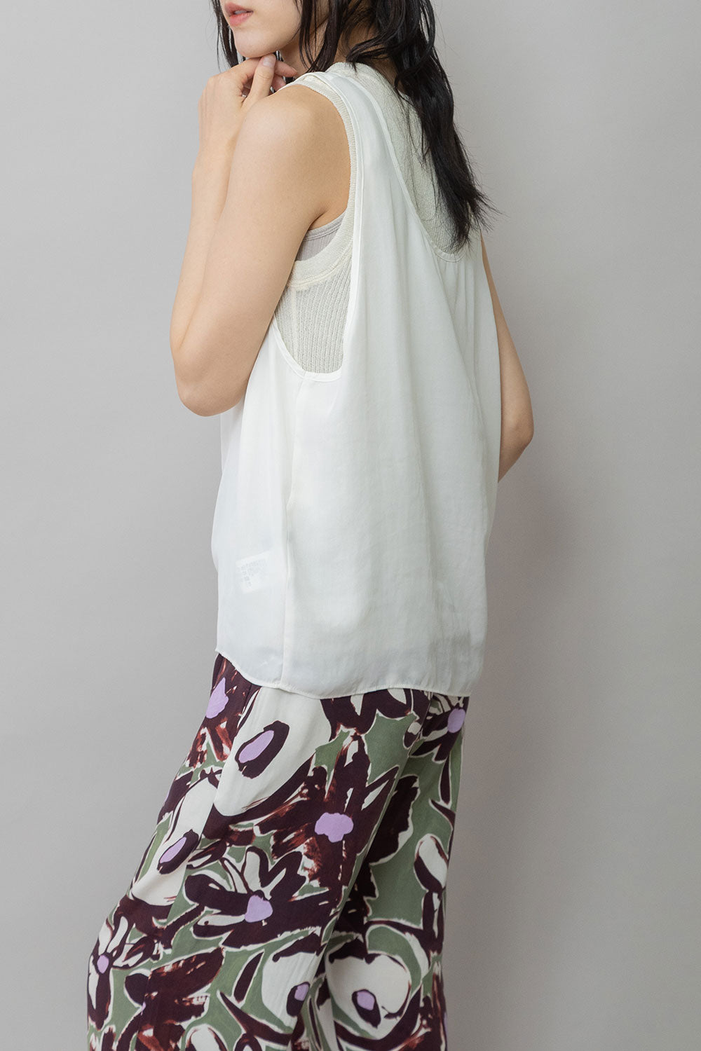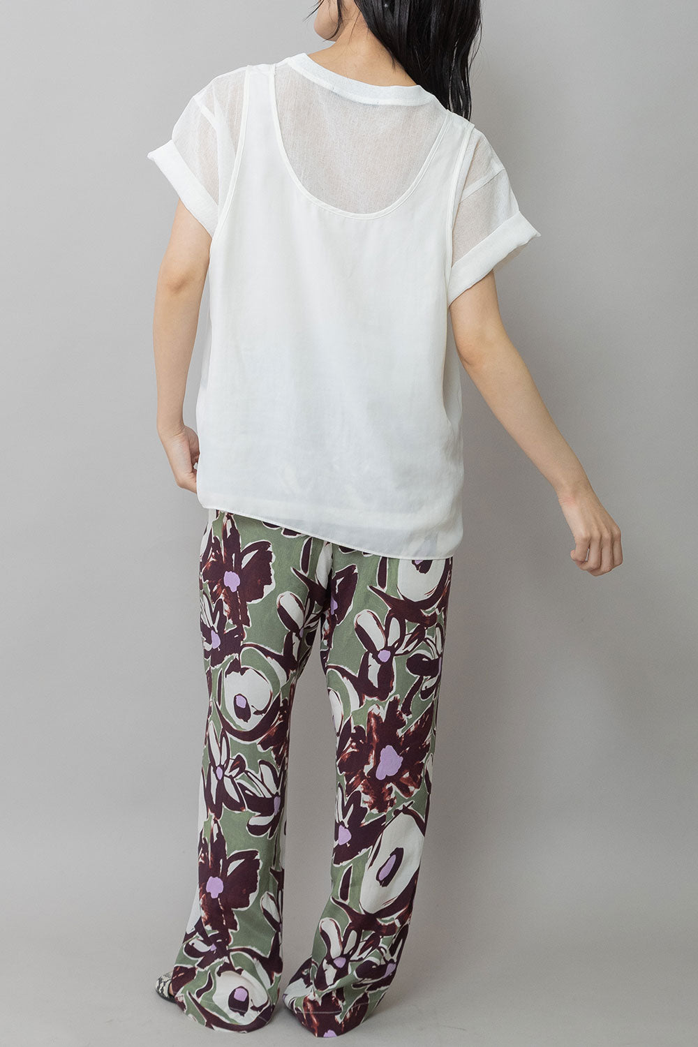 シルクライクなフィブリル感のあるタンクトップとシアーなTシャツの組み合わせを布帛ならではのエアリーなゆるいシルエットでまとめたトップスです。