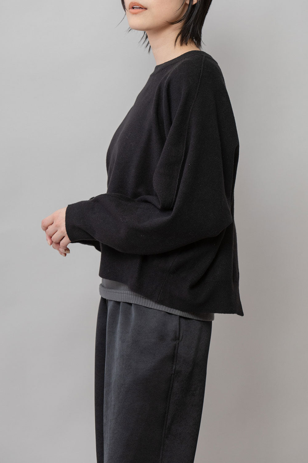 12GGのゴム地に編立て、元々程良い柔らかさと弾力を持ち合わせた素材に、体のラインを拾いにくい編地に仕上げ、着心地良い風合いに仕上げています。
