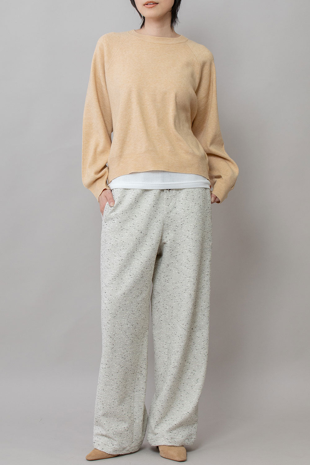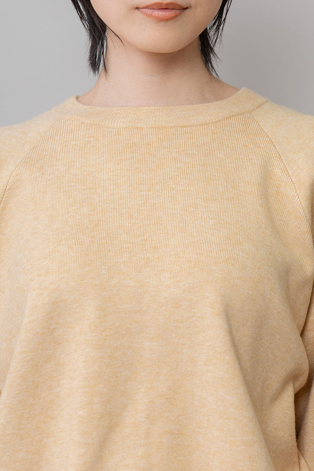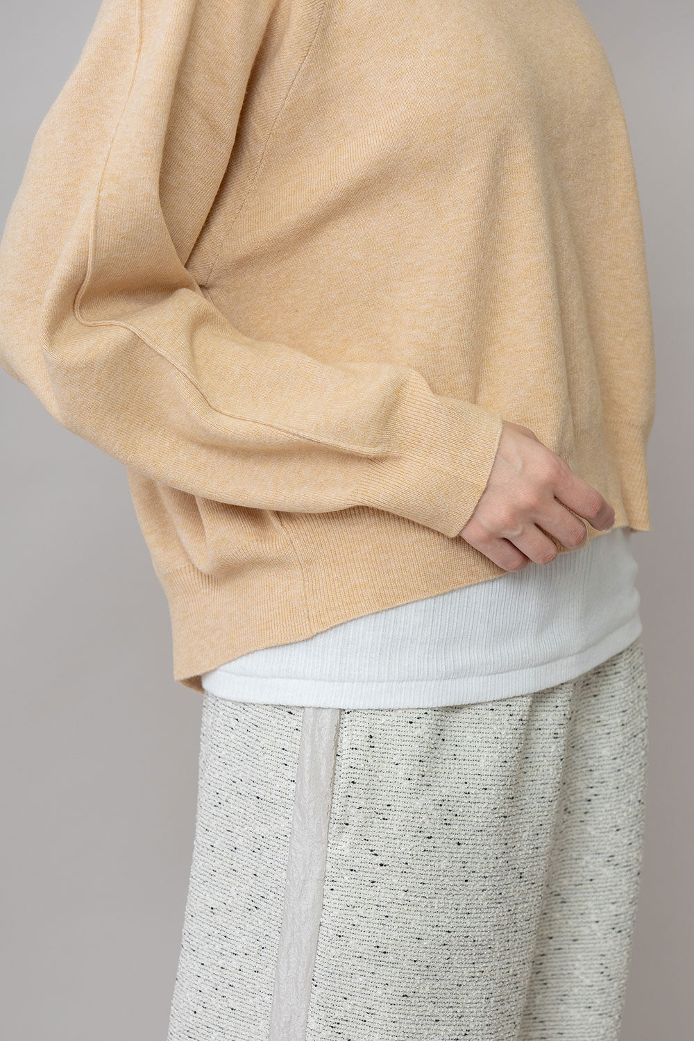 暖かみ、適度な重みもあり、毛羽も少なく秋の立ち上がりから長く着られる素材感で、肌触りはソフトなタッチでチクチクしないストレスフリーな着心地です。