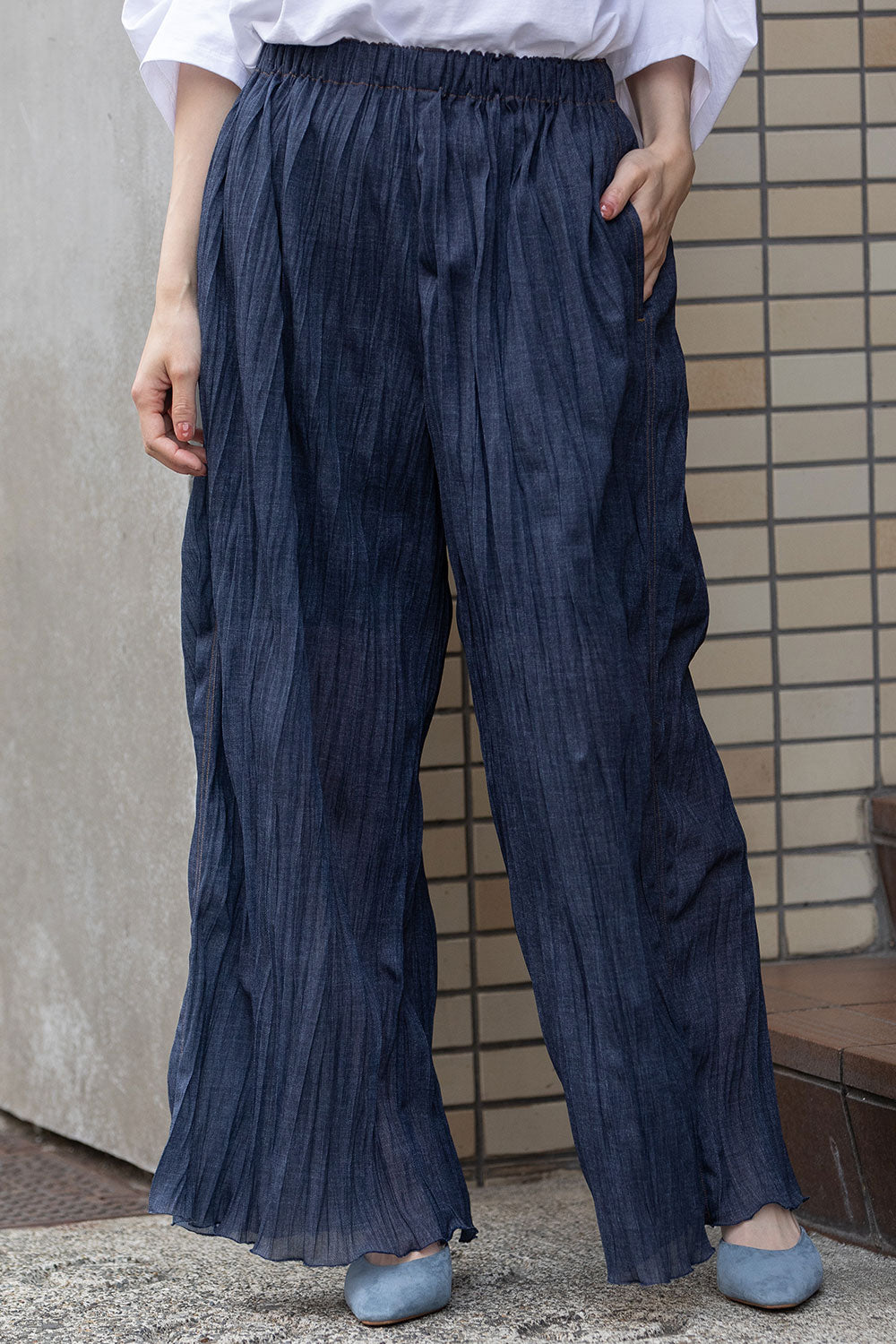 トリコットの軽さしなやかさにデニムの持つラフな表情とワッシャープリーツによる陰影をシンプルに生かしたワイドパンツです。