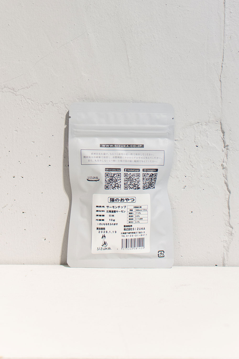 北海道産の新鮮な鮭を猫ちゃんの食べやすいサイズで薄くスライスしたおやつです。